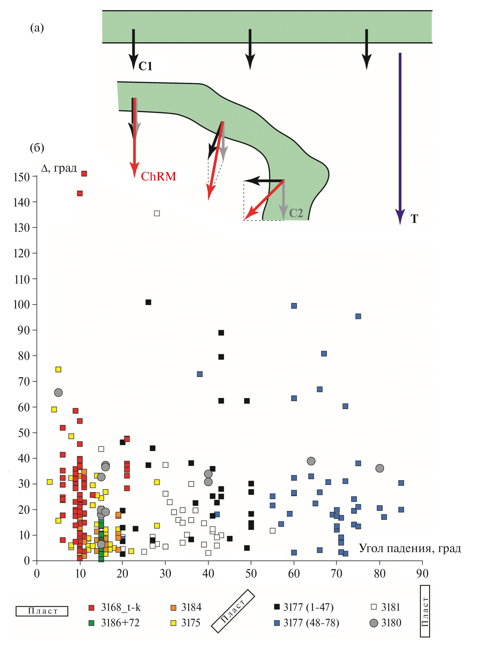 В обнажении 3176 на горе Чуку ChRM (равно как и любые другие компоненты Jn) удалось выделить лишь на единичных уровнях (рис. 3). По своему плохому палеомагнитному качеству эти породы схожи с кампанскими отложениями в разрезах Аксу-Дере и Кудрино-2 [Гужиков и др., 2021б].