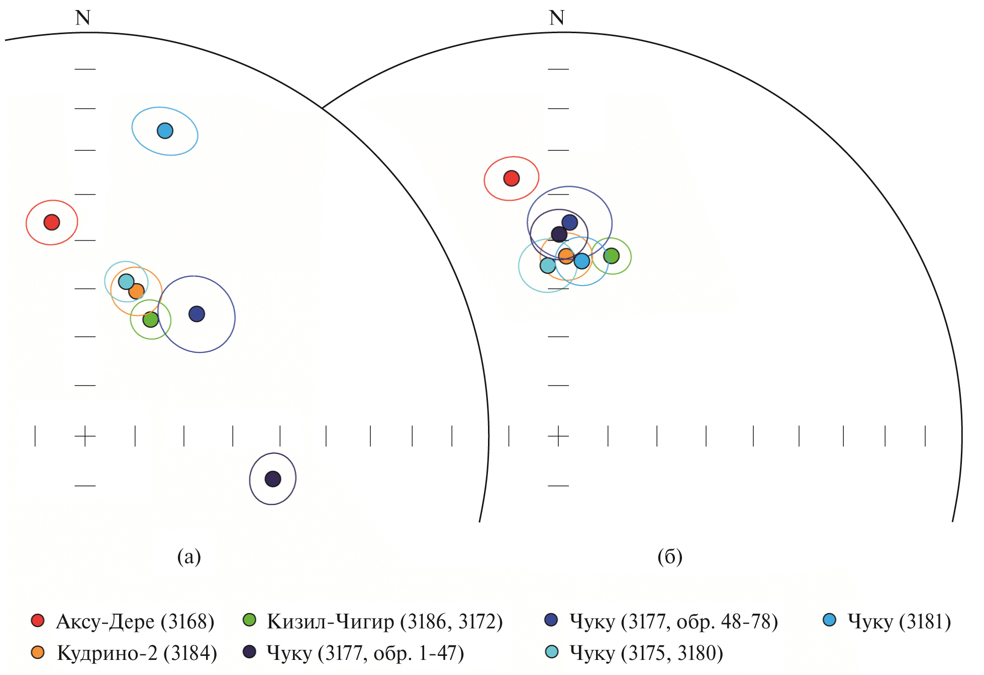 Почти все палеомагнитные направления проецируются на нижнюю полусферу и группируются в северном полушарии, то есть соответствуют прямой (нормальной) полярности поля (рис. 3, рис. 4, рис. 7). Разрез Аксу-Дере (верхний турон, коньяк, верхний сантон) и обнажение 3177 разреза Чуку (нижний(?)–верхний сантон) отмечены очень большими разбросами палеомагнитных направлений. Разрезам Кизил-Чигир (нижний – средний турон), Кудрино-2 и обнажениям 3175 и 3181 разреза Чуку (верхи верхнего сантона) свойственны более высокие кучности ChRM (табл. 2, рис. 7).