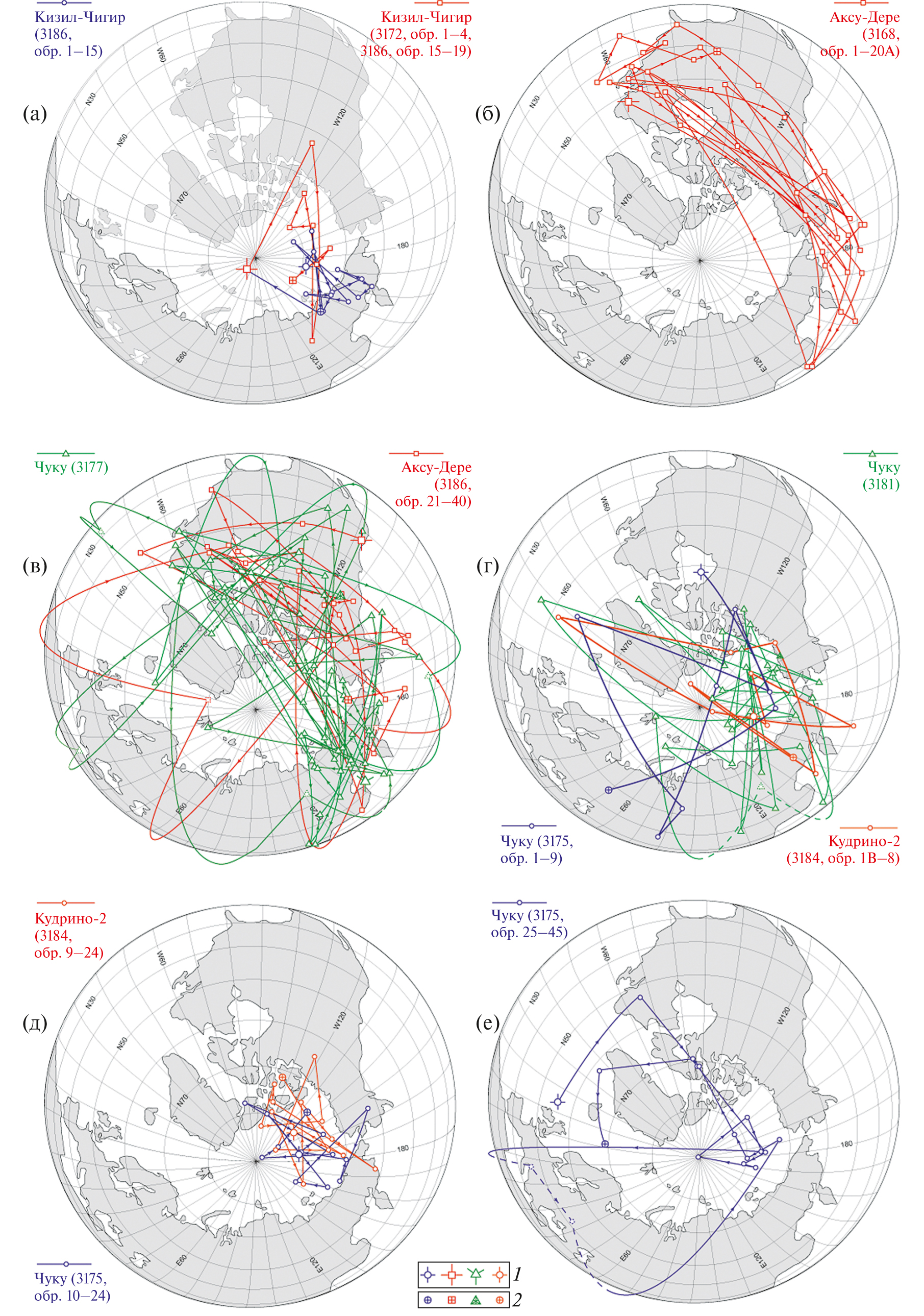 Рис. 11. Траектории ВГП для различных возрастных срезов: (а) – ранний–средний турон; (б) – поздний турон–коньяк; (в) – ранний(?)–поздний сантон; (г) – поздний сантон; (д) – конец позднего сантона; (е) – пограничный интервал сантона–кампана. Условные обозначения: исходные (1) и конечные (2) точки траекторий ВГП.