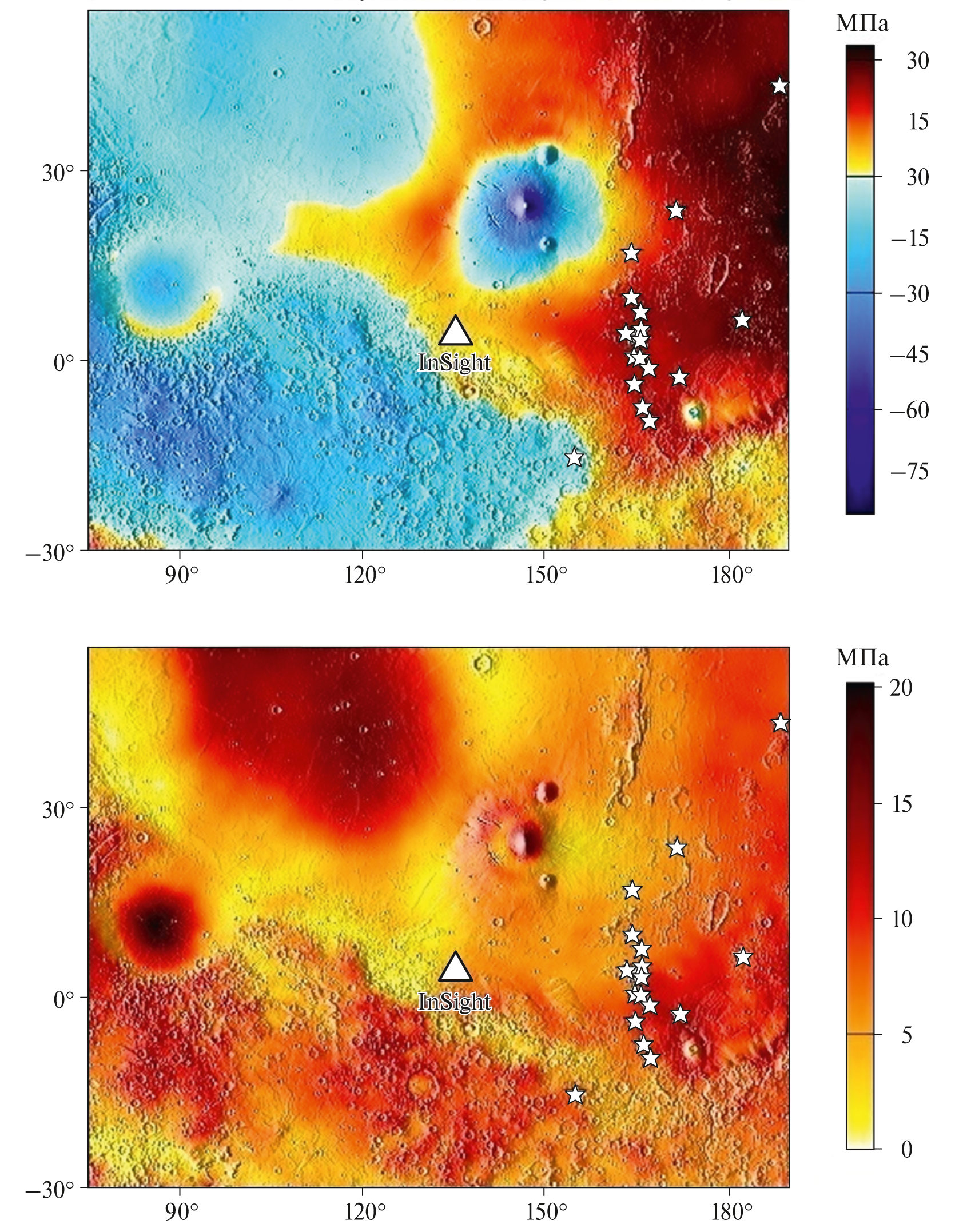 Сравнение теоретически рассчитанных негидростатических напряжений в регионе равнины Элизий (Elysium Planitia) с данными локации эпицентров сейсмических событий на Марсе в этом регионе показано на рис. 2. Рисунок соответствует модели внутреннего строения Марса с толщиной коры 50 км, толщина литосферы 300 км, под литосферой имеется ослабленный слой µ = 0.1µ0 до глубины 1140 км (µ0 – значение модуля сдвига для чисто упругой модели). В поле напряжений под щитом Элизий (Elysium) преобладает поле сжимающих напряжений, в то время как к востоку от плато Элизий (Elysium Planitia) прослеживаются значительные растягивающие напряжения в литосфере, действительно достаточные для возникновения сейсмических событий. Значительные касательные напряжения в зонах растяжения хорошо коррелируют с выявленными эпицентрами марсотрясений. Ранее принятый критерий выбора зон с большими значениями напряжений сдвига на фоне существенных растягивающих напряжений как наиболее вероятных областей очагов марсотрясений, оправдал ожидания. Возможная плюмовая активность этого района [Broquet, Andrews-Hanna, 2022] может приводить к сбрасыванию накопившихся напряжений.