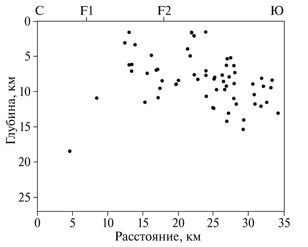 Рис. 3. Проекции гипоцентров землетрясений за период 1991–1996 гг. на разрез [Ghose et al., 1998]. F1 и F2 обозначают расположение Иссык-Атинского и Шамси-Тюндюкского разломов (рис. 1), соответственно.