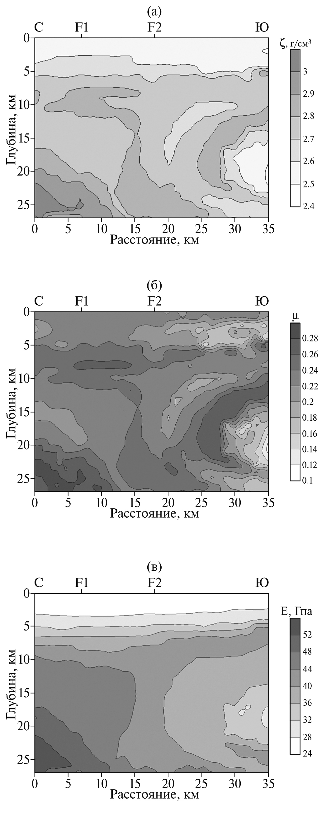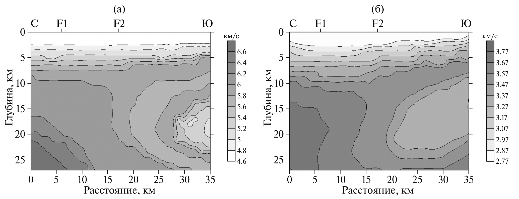 На этом фоне под Кыргызским хребтом на глубинах от 12 до 22 км выделяется линзообразная зона относительно низких скоростей продольных волн VP протяженностью примерно 40 км (на рис. 4а, 4б видна ее северная часть). Скорость поперечных волн VS внутри линзы также немного уменьшается. Отметим в этой связи, что на основе комплексного анализа построенных разрезов физико-механических свойств пород этого участка в работе [Спичак, Гойдина, 2022] была предложена концептуальная модель линзы, отвечающая на вопросы об источниках геофизических аномалий и вероятном механизме их образования.