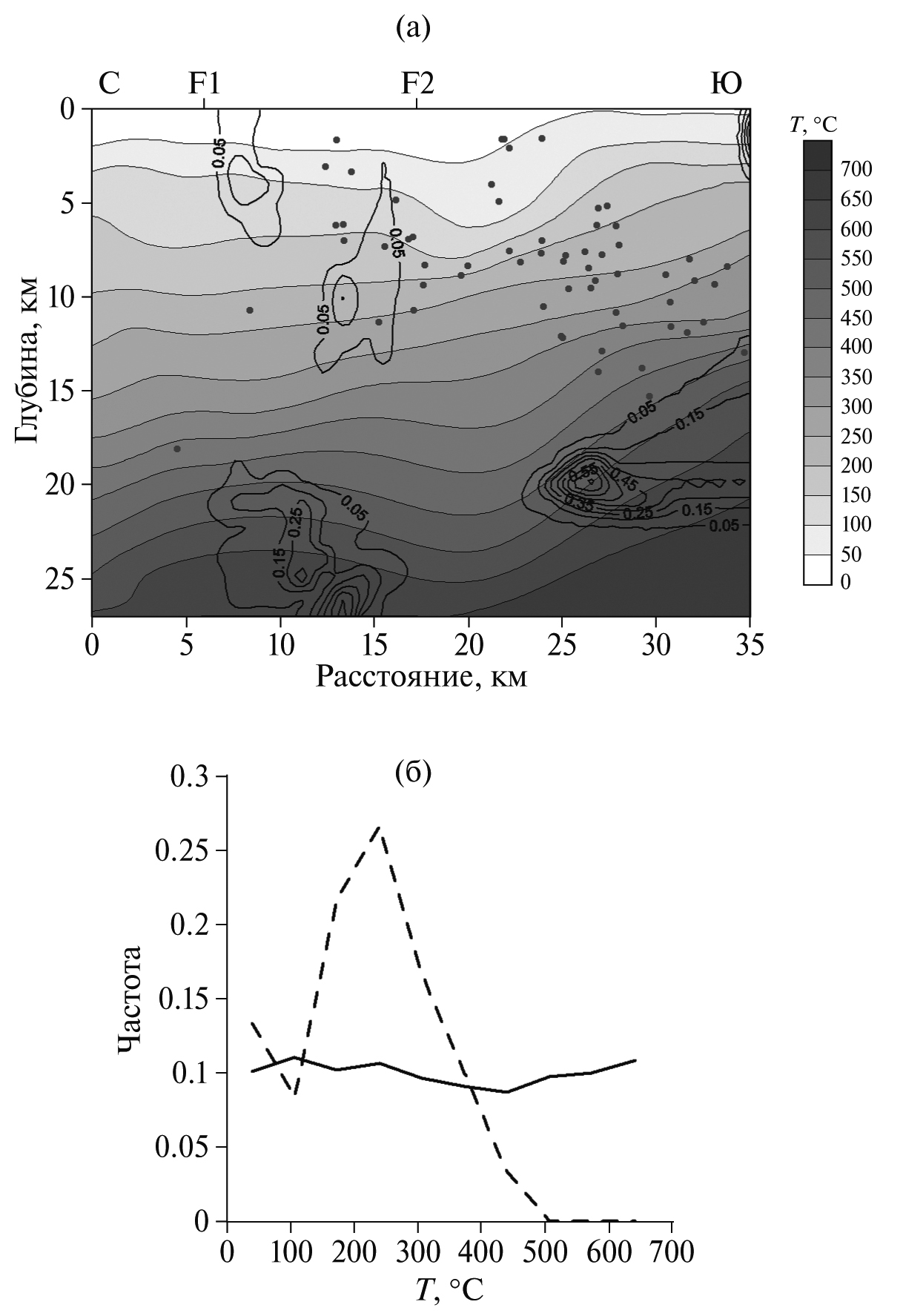 Рис. 6. (а) – разрез температуры вдоль профиля CD, построенный с помощью электромагнитного геотермометра, с наложенными на него изолиниями флюидной пористости [Спичак, Гойдина, 2022] и гипоцентрами землетрясений [Ghose et al., 1998]; (б) – графики частоты значений температуры в узлах регулярной сетки во всей области (сплошная линия) и в гипоцентрах землетрясений (штриховая линия). Точки обозначают гипоцентры землетрясений (см. рис. 3).