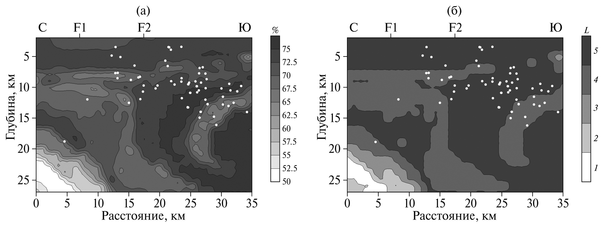 Флюидная пористость в гипоцентрах составляет менее 0.05% (рис. 6а). Соответственно, если в северной части разреза землетрясения могут происходить до глубины примерно 18 км (рис. 7а), то в его южной части нижняя граница гипоцентров проходит вдоль верхней границы “линзы”, предположительно заполненной надкритическим раствором [Спичак, Гойдина, 2022].