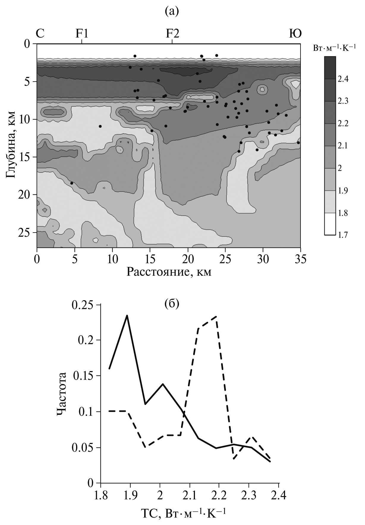 Сравнительный анализ распределения теплопроводности во всей области и в гипоцентрах землетрясений показывает, что соответствующие диапазоны практически совпадают (см. табл. 1). В то же время, если максимальная частота ее значений в узлах сетки приходится на диапазон 1.7–1.9 Вт · м–1 · К–1, соответствующий породам осадочного чехла, то максимальная частота ее значений в гипоцентрах приходится на диапазон (2.05–2.25 Вт · м–1 · К–1), соответствующий гранодиоритам и гранитам (см. рис. 7б).