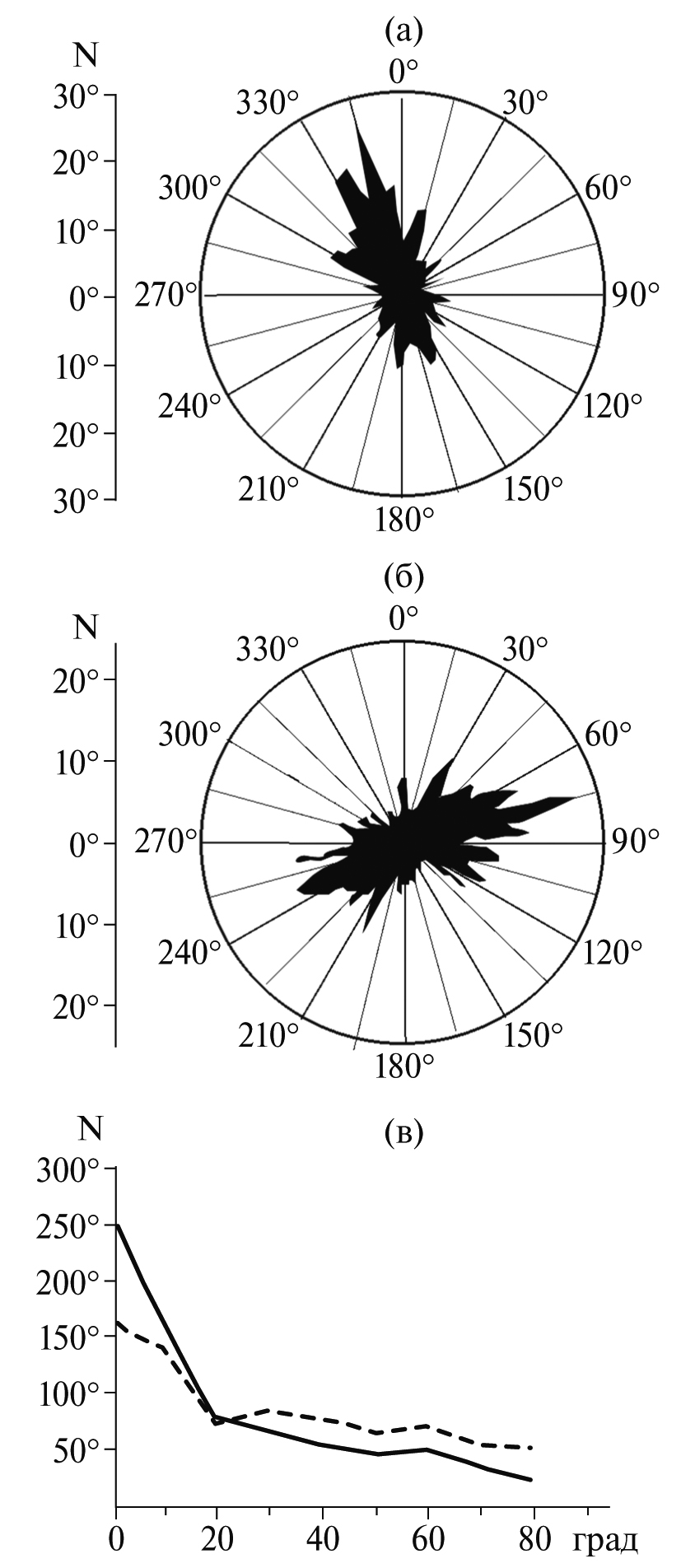 Рис. 10. Диаграммы распределения азимутов осей сжатия (а) и растяжения (б) в диапазоне глубин 5–15 км [Сычева и др., 2014, рис. 5]; (в) – распределения углов погружения осей сжатия (сплошная линия) и растяжения (штриховая линия) [Сычева и др., 2014, рис. 6].
