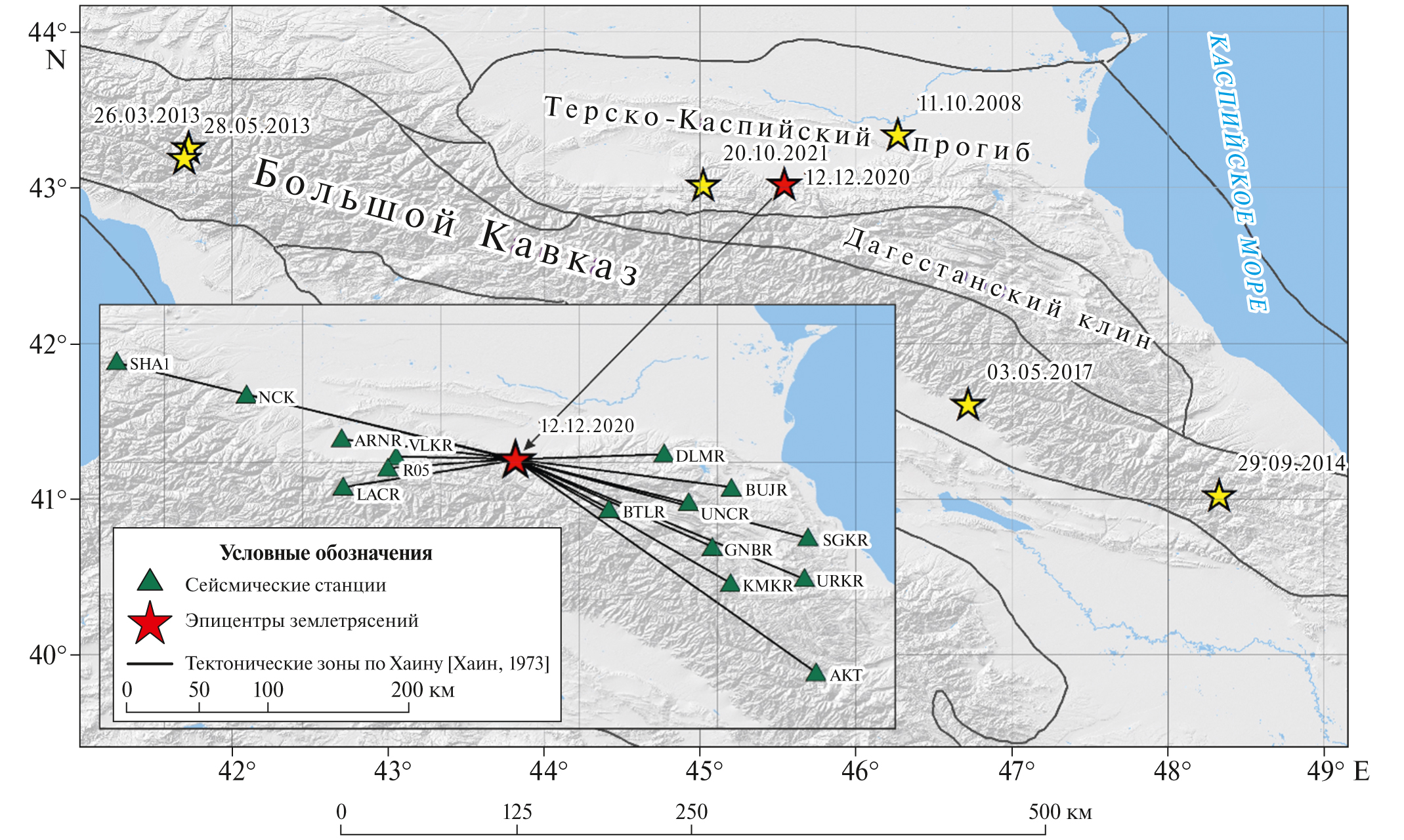 На данном участке Альпийско-Гималайского подвижного пояса геодинамическая обстановка в значительной степени контролируется условиями коллизии Евразийской и Аравийской литосферных плит, ответственными за всю совокупность разномасштабных сейсмотектонических процессов в неоднородной геологической среде [Philip et al., 1989; Ershov et al., 2003; Koulakov et al., 2012; Собисевич и др., 2015; Milyukov et al., 2015; Kaban et al., 2018; Лукк, Шевченко, 2019; Ismail-Zadeh et al., 2020; Трифонов и др., 2020; Rogozhin et al., 2020; Магомедов, Мамаев, 2022]. Основные сейсмогенерирующие структуры региона представлены крупнейшими шовными зонами и узлами их пересечения, определяемыми системами активных разломов общекавказского, поперечного (северо-восточного) и диагонального (северо-западного) простирания [Несмеянов, 2012; Рогожин и др., 2014; Магомедов, Мамаев, 2022].