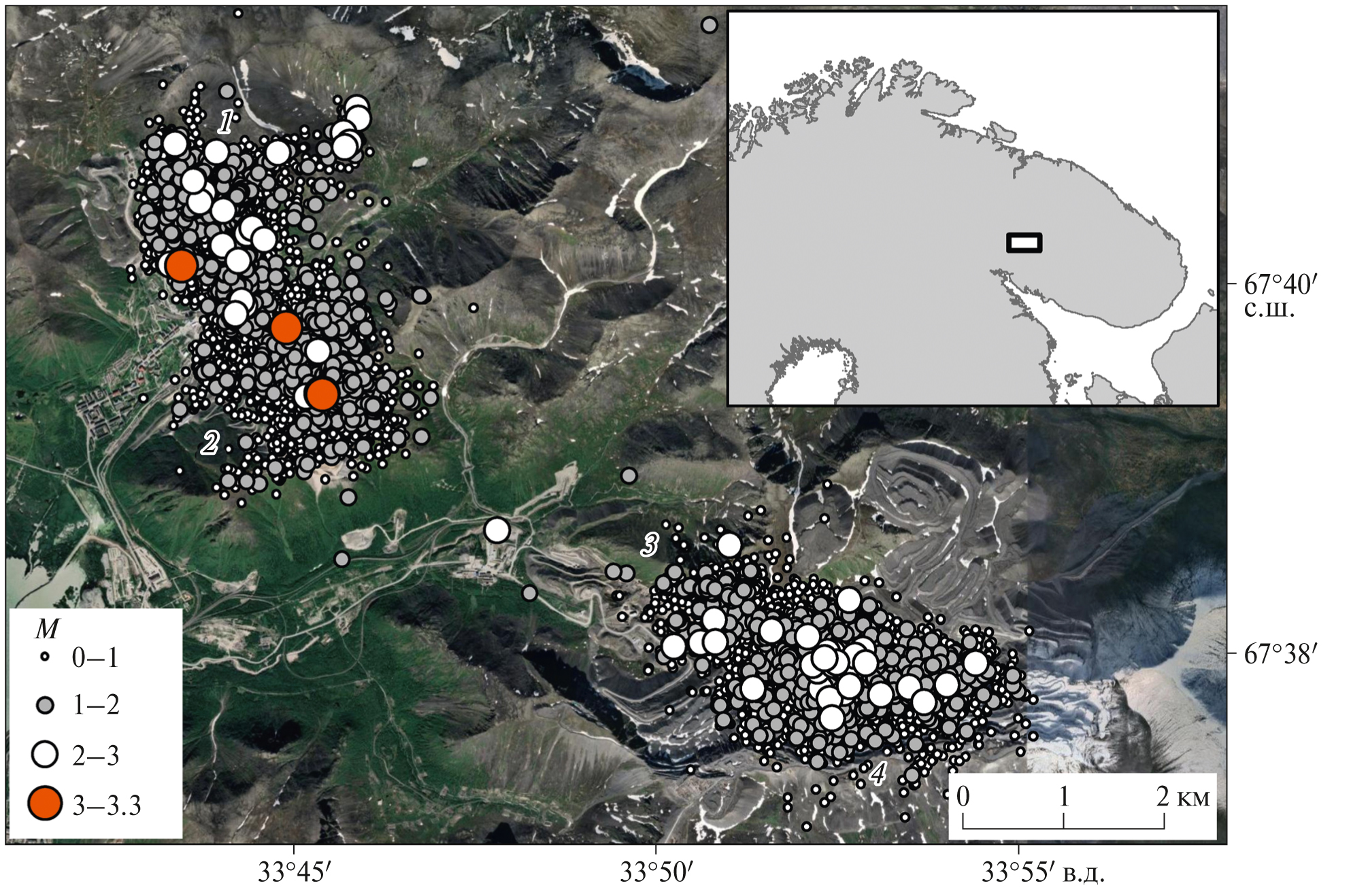 Рис. 1. Эпицентры сейсмических событий с M ≥ 1.5, зарегистрированные на месторождениях Хибинского массива за период 2002–2022 гг. Цифрами показаны месторождения: 1 – Кукисвумчоррское; 2 – Юкспорское (отрабатывает Кировский рудник); 3 – Апатитовый Цирк (Расвумчоррский рудник); 4 – Плато Расвумчорр (до 2014 г. Центральный, в настоящее время – Восточный рудник). Прямоугольником на вставке обозначено местоположение района исследований.