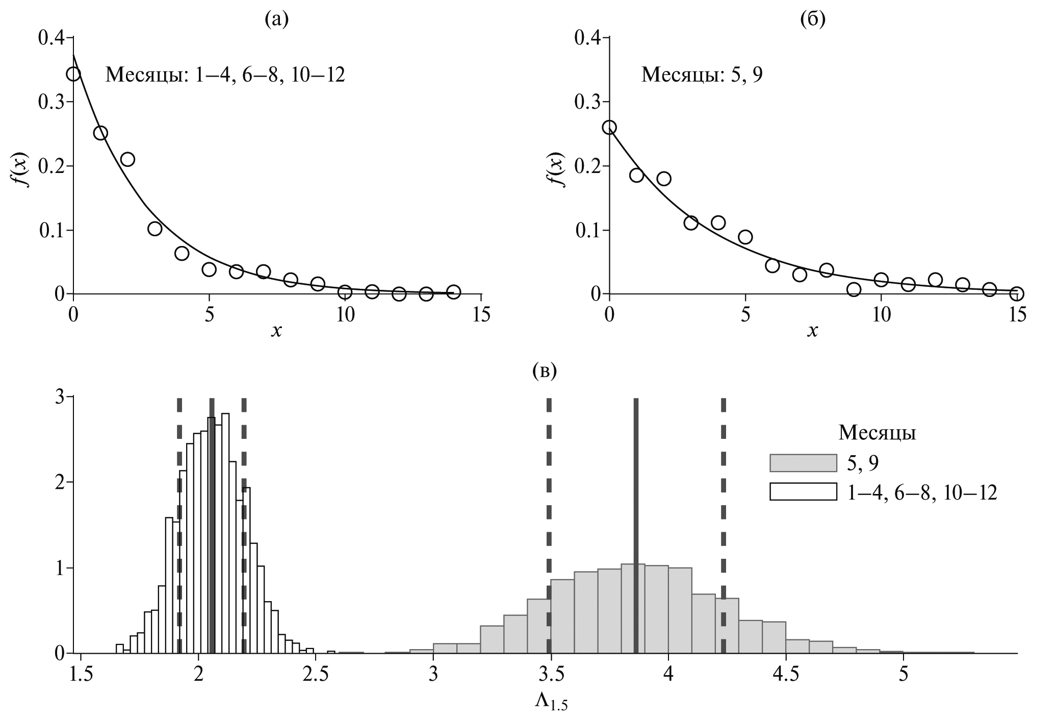 Для того чтобы яснее показать влияние обводненности на продуктивность землетрясений, мы оценили значения параметра распределения (2) Λ1.5 в мае, сентябре и в остальные месяцы года (рис. 6). Получились следующие оценки: в мае, сентябре Λ1.5 ± σ = 2.05 ± 0.14 (σ – стандартная ошибка); в остальные месяцы Λ1.5 ± σ = 3.87 ± 0.38. Таким образом, обнаруженное увеличение продуктивности землетрясений на месторождениях Хибин в мае и сентябре по сравнению с остальными месяцами года является значимым (отличия значений параметра Λ1.5 составляют более 3σ).