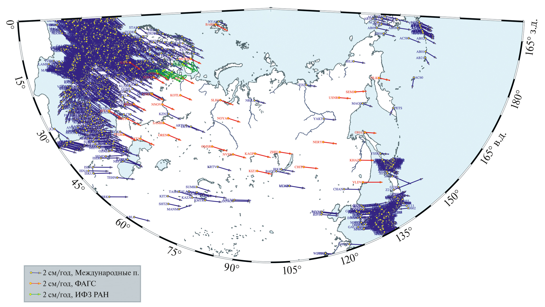 Рис. 8. Карта скоростей геодезических пунктов, использовавшихся для оценки площадных деформаций. Синим цветом показаны международные пункты, красным – пункты ФАГС и зеленым – периодически наблюдаемые экспедиционные пункты ИФЗ РАН.