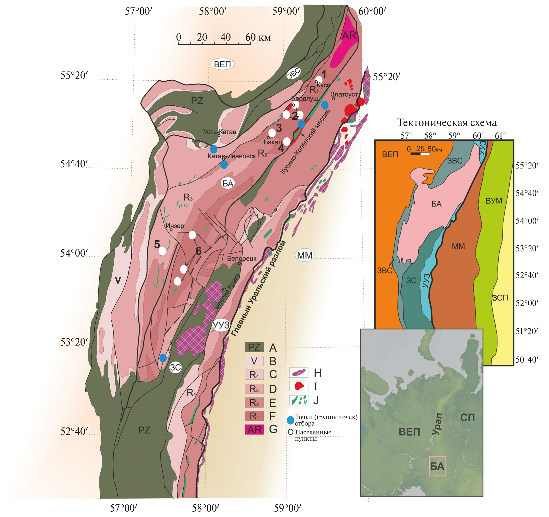 Рис. 1. Геологическая схема Юго-Западного Урала. Схема расположения Башкирского антиклинория на спутниковом снимке и в тектонической структуре Южного Урала. Схемы составлены согласно геологической карте и тектонической схеме в работе [Козлов и др., 2001], с уточнениями по работе [Пучков., 2010]), с упрощениями. Тектонические единицы: ВЕП – Восточно-Европейская платформа; ЗВС – Западно-Уральская зона внешней складчатости; БА – Башкирский антиклинорий; ЗС – Зилаирский синклинорий; УУЗ – Уралтауско-Уфалейская зона (Уралтауский антиклинорий на юге и Уфалейский антиклинорий на севере); ММ – Магнитогорская мегазона; ВУМ – Восточно-Уральская мегазона; ЗСП – Западно-Сибирская плита. Буквами A–J на геологической схеме обозначены: A – палеозойские нерасчлененные образования; B–F – осадочные отложения рифея и венда; G – архей-раннепротерозойские метаморфические комплексы фундамента Восточно-Европейской платформы. Плутонические образования (H–J): H – ультрамафиты офиолитовых комплексов; I – интрузивы кислого состава; J – интрузивы основного состава; 1–6 – районы опробования (нумерация соответствует приведенной в тексте). Места отбора интрузивных тел (групп интрузивных тел), отнесенных к какому-либо из районов, обозначены белыми кружками, прочие точки отбора показаны синими кружками.