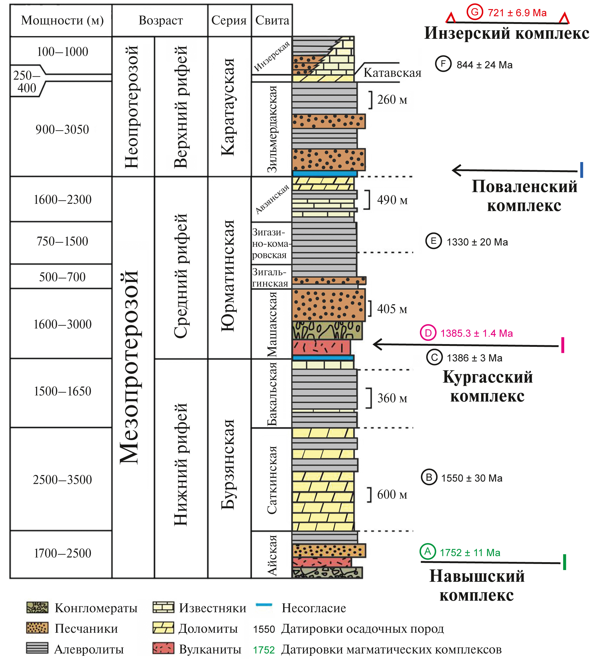 Рис. 2. Стратиграфическая колонка Башкирского антиклинория [Doyle et al., 2018] с дополнениями. Справа подписаны магматические комплексы, стрелкой показаны стратиграфические единицы, с которыми соотносят магматические комплексы по возрасту. Датировки: A – U-Pb по цирконам [Краснобаев и др., 2013]; B – Pb-Pb возраст карбонатов саткинской свиты [Кузнецов и др., 2008]; C – U-Pb по цирконам [Puchkov et al., 2013]; D – U-Pb, ID TIMS, по цирконам [Ernst et al., 2006]; E – Pb-Pb, фосфоритовые конкреции зигазино-комаровской свиты [Овчинникова и др., 2013]; F – Pb-Pb, карбонаты [Kuznetsov et al., 2017]; G – U-Pb, габброиды [Князев и др., 2013].
