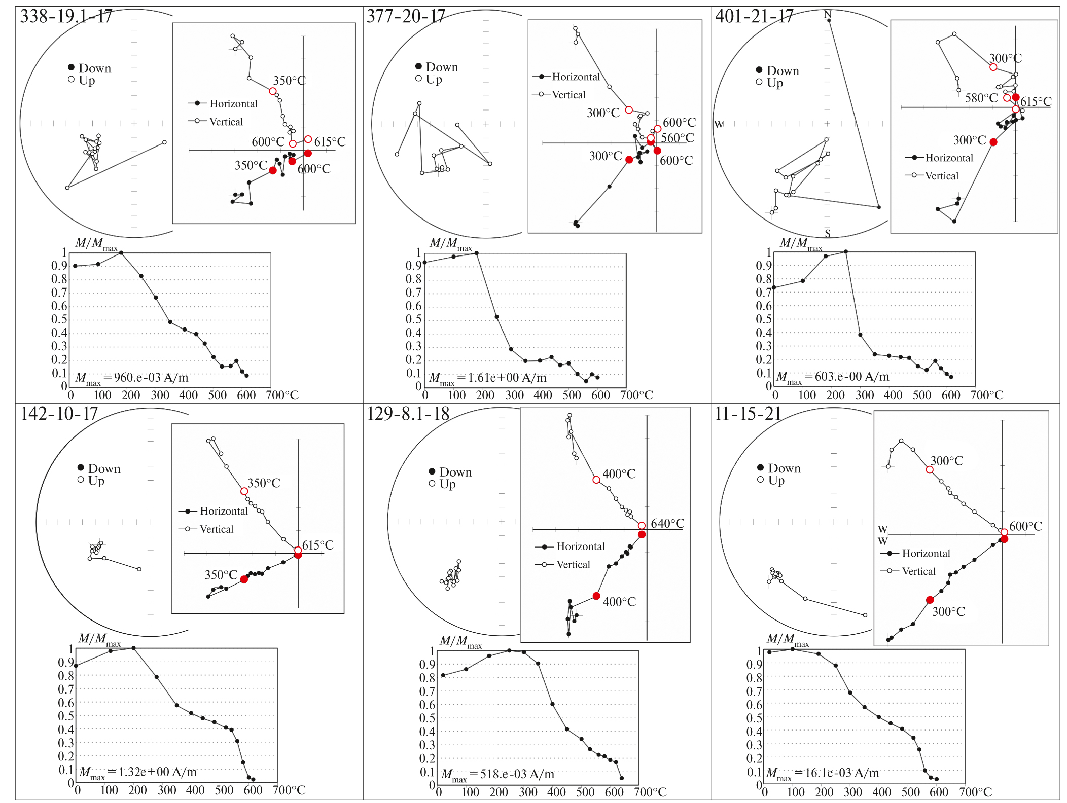При оценке качества магнитной записи мы считаем запись хорошей, если компоненту можно однозначно выделить по прямой на диаграмме Зийдервельда (значения MAD, максимального углового отклонения, ∼10° и меньше) и соответствующей тесной группе точек на стереограмме, отсутствуют новообразования при ступенчатой температурной чистке, выделяемая компонента является единственной стабильной в образцах. Плохой мы считаем запись, когда сигнал хаотичен, значения MAD значительно превышают 20°, запись плохо интерпретируемая, происходят изменения в процессе температурной чистки. Промежуточные варианты мы обозначаем как среднее качество палеомагнитного сигнала.