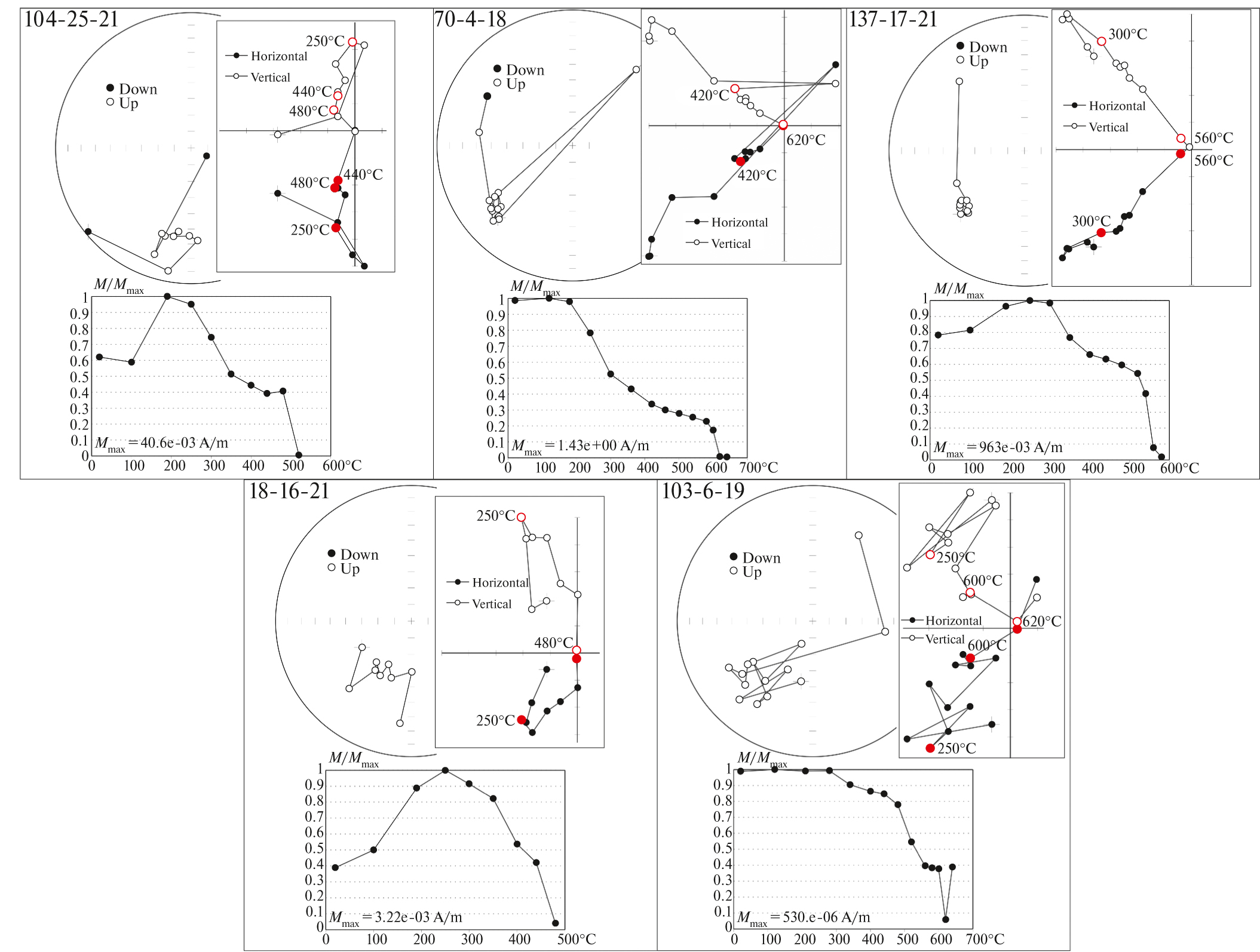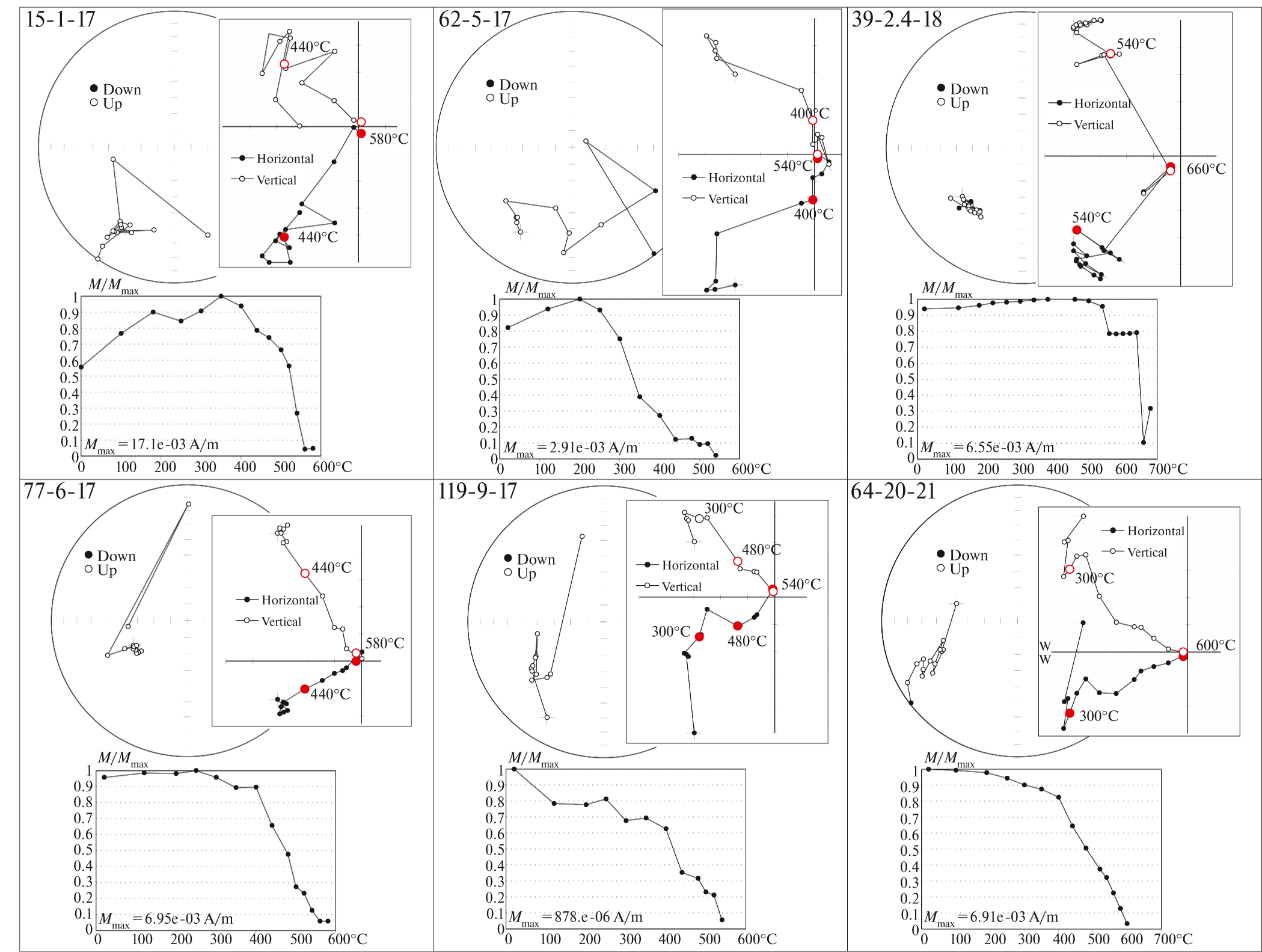 Лабораторные палеомагнитные исследования и обработка результатов магнитных чисток выполнялись в лаборатории Главного геомагнитного поля и петромагнетизма ИФЗ РАН. Все образцы были подвергнуты ступенчатой температурной чистке до полного размагничивания (8–17 шагов), которое достигалось в большинстве случаев при температурах 540–680°С, или до появления хаотической палеомагнитной записи, связанной с минеральными новообразованиями при температурной чистке. Для размагничивания образцов использовались немагнитные печи “MMTD-80” и “MMTD24” с величиной нескомпенсированного поля не более 5–10 нТл. В ряде случаев для проверки дубли образцов подвергались чистке переменным полем. Остаточная намагниченность образцов измерялась при помощи спин-магнитометра JR-6 AGICO или криогенного магнитометра 2G Enterprises. Обработку измерений остаточной намагниченности выполняли при помощи пакетов программ Enkin [Enkin, 1994] и Remasoft [Chadima, Hrouda, 2006], использующих при выделении компонент намагниченности метод компонентного анализа согласно работе [Kirschvink, 1980]. Анализ полученных палеомагнитных данных производился с использованием статистики Фишера [Fisher, 1953]. Измерения зависимости магнитной восприимчивости от температуры проводились на каппометре MFK-1FA компании AGICO с термоприставкой CS3, на воздухе со скоростью нагрева/охлаждения 11–13°С/мин, измерения производились на порошке измельченных образцов. Зависимости намагниченности насыщения и остаточной намагниченности насыщения от температуры Js(T) и Jrs(T) измерялись на 1 см3 образцах на вибротермомагнитометре конструкции Ю.К. Виноградова. Js измерялась в полях в диапазоне 450–520 мТл при скорости нагрева/охлаждения 1°С/сек. Jrs создавалась в поле величиной 1 Тл, скорость нагрева/охлаждения – 1°С/с.