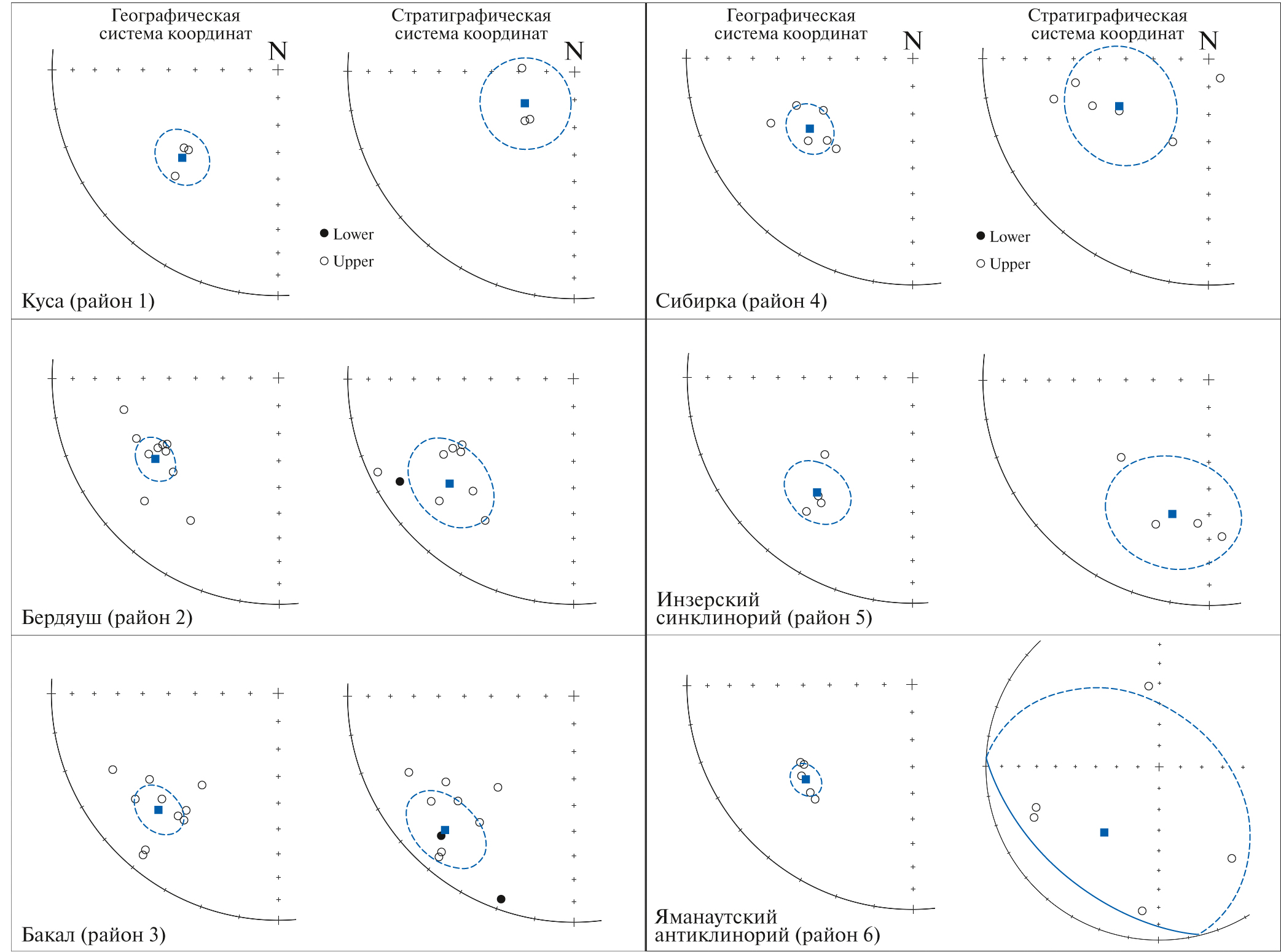 Для расчета среднего палеомагнитного направления по району г. Куса (район 1, табл. 1) были использованы 3 интрузии (3 сайта), α95 в географической системе (современной, в нашем случае постскладчатой) 10.1°, в стратиграфической системе (древней, с коррекцией по элементам залегания вмещающих пород) 16.4°. Среднее по району пос. Бердяуш (район 2, табл. 1) рассчитано по 11 интрузиям (10 сайтов, интрузии 13-17 и 14-17 объединены в один сайт, среднетемпературная компонента дайки 16-6 не вошла в расчет, так как в ней возможно частичное перекрытие спектра блокирующих температур среднетемпературной вторичной и высокотемпературной первичной компонент), α95 в географической системе 7.5°, в стратиграфической – 15.4°.