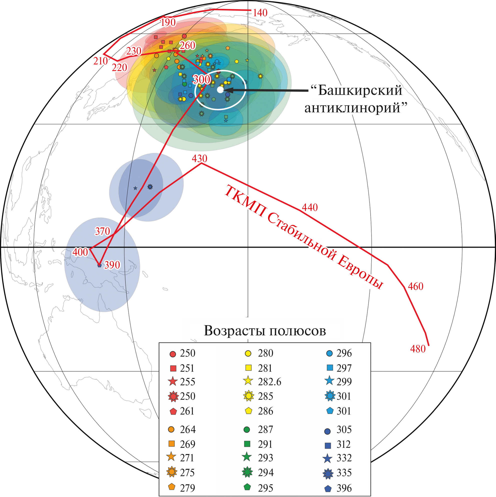 The Late Paleozoic remanence component yielded a paleomagnetic pole of Plong = 171.6°, Plat = 39.9°, α95 = 5.9°, N = 6 from 6 areas (38 sites) in the Bashkirian megazone. The obtained pole is statistically indistinguishable from the mean of 15 poles for Stable Europe with ages of 280–301 million years. Thus, the secondary Late Paleozoic component in the Bashkirian megazone formed approximately 280–301 million years ago, after which the Bashkirian megazone did not experience any relative motions with respect to the East European craton.