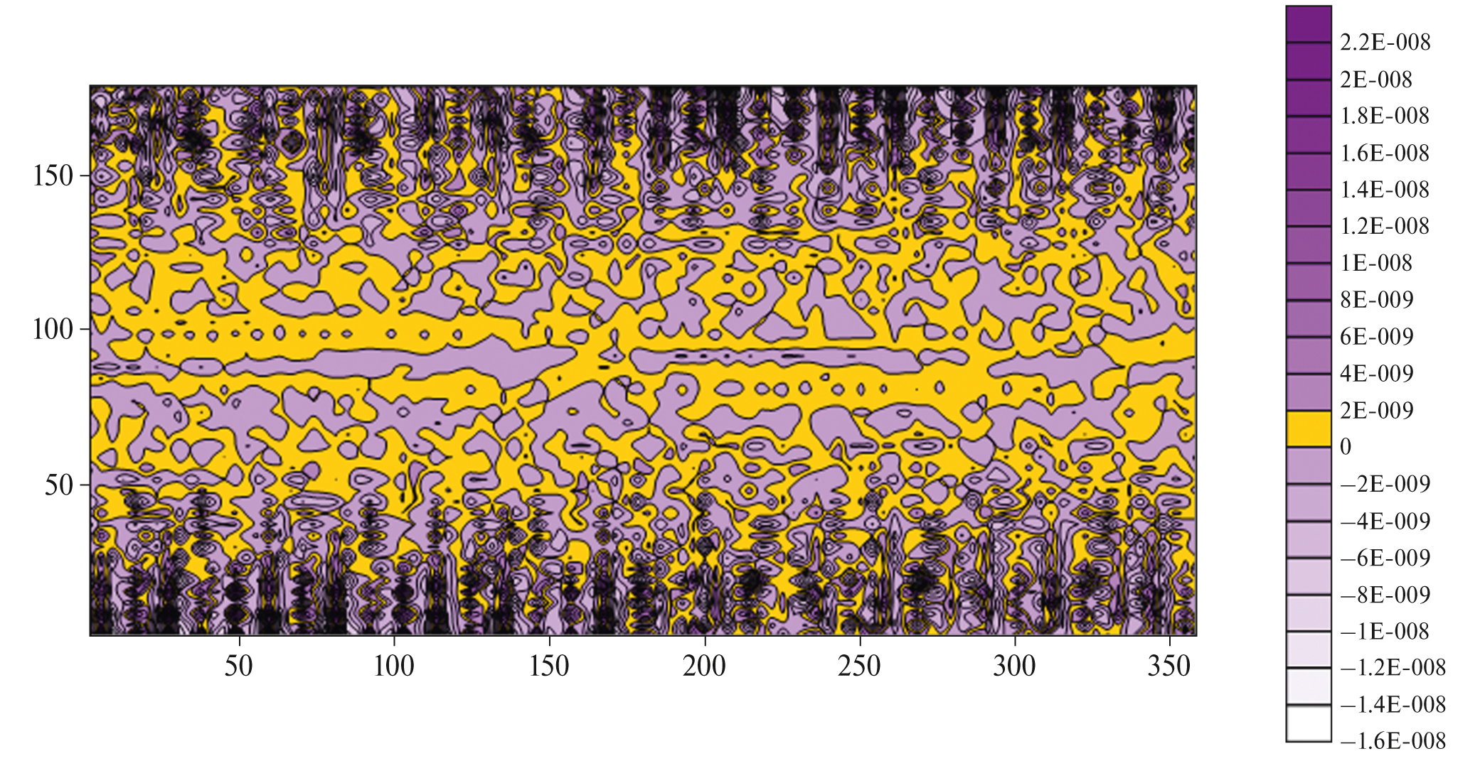 Далее, в точках той же самой сети наблюдений, для которой были вычислены значения радиальной компоненты магнитного поля по известной формуле для разложения гравитационного потенциала в ряд по полностью нормированным присоединенным функциям Лежандра [Gudkova et al., 2020], нами были выполнены расчеты радиальной компоненты гравитационного поля Меркурия.