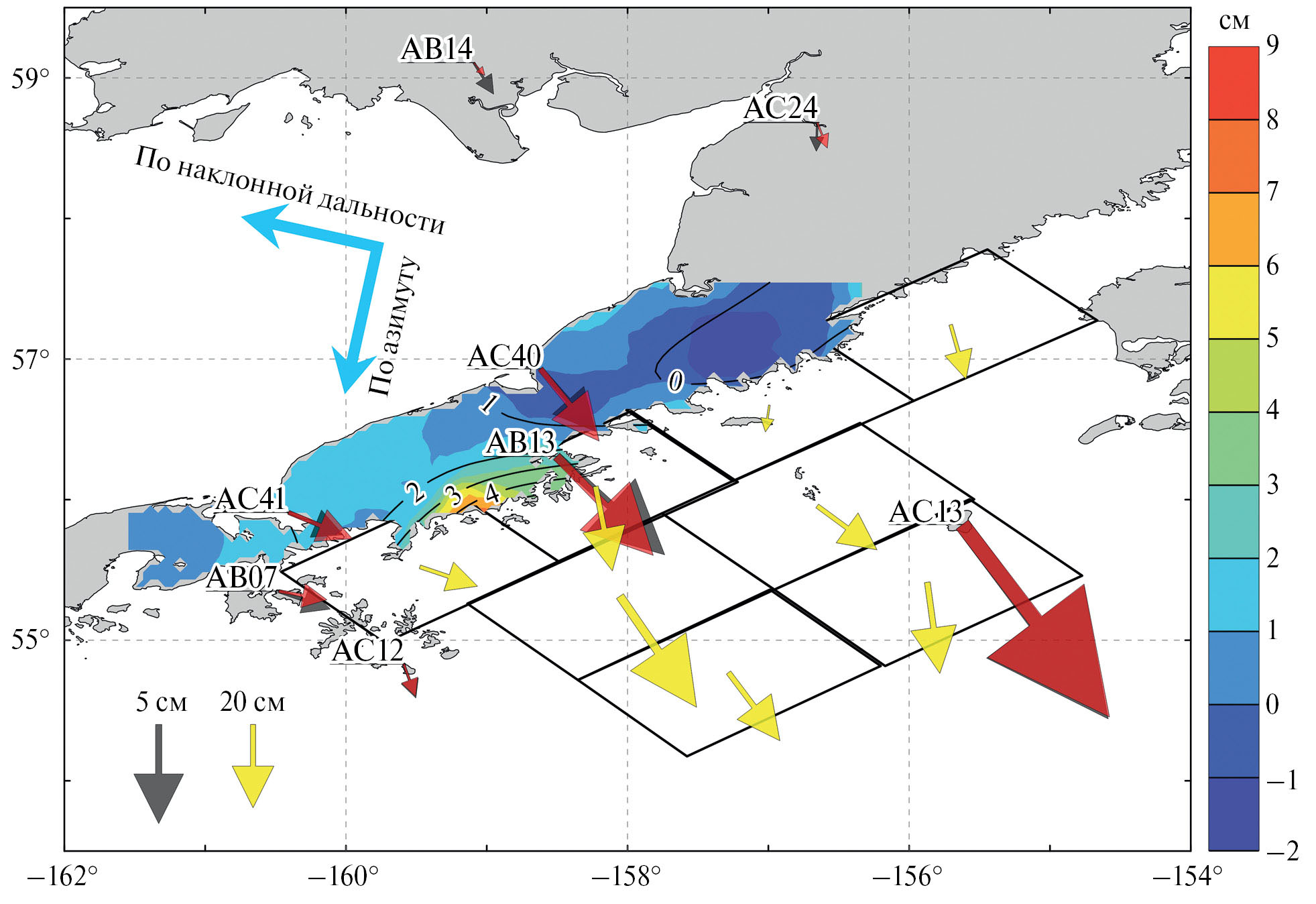 На рис. 8 показана проекция плоскостей на дневную поверхность и сопоставление смещений пунктов GPS и смещений земной поверхности в направлении на спутник по данным интерферометрии. Различия в абсолютных величинах горизонтальных смещений на пунктах GPS не превосходят 1 см. Наибольшие различия в поле смещения по данным РСА интерферометрии фиксируются в области локального максимума у береговой линии и, очевидно, связаны с недостаточной детальностью модели поверхности, принятой для описания крипового процесса.