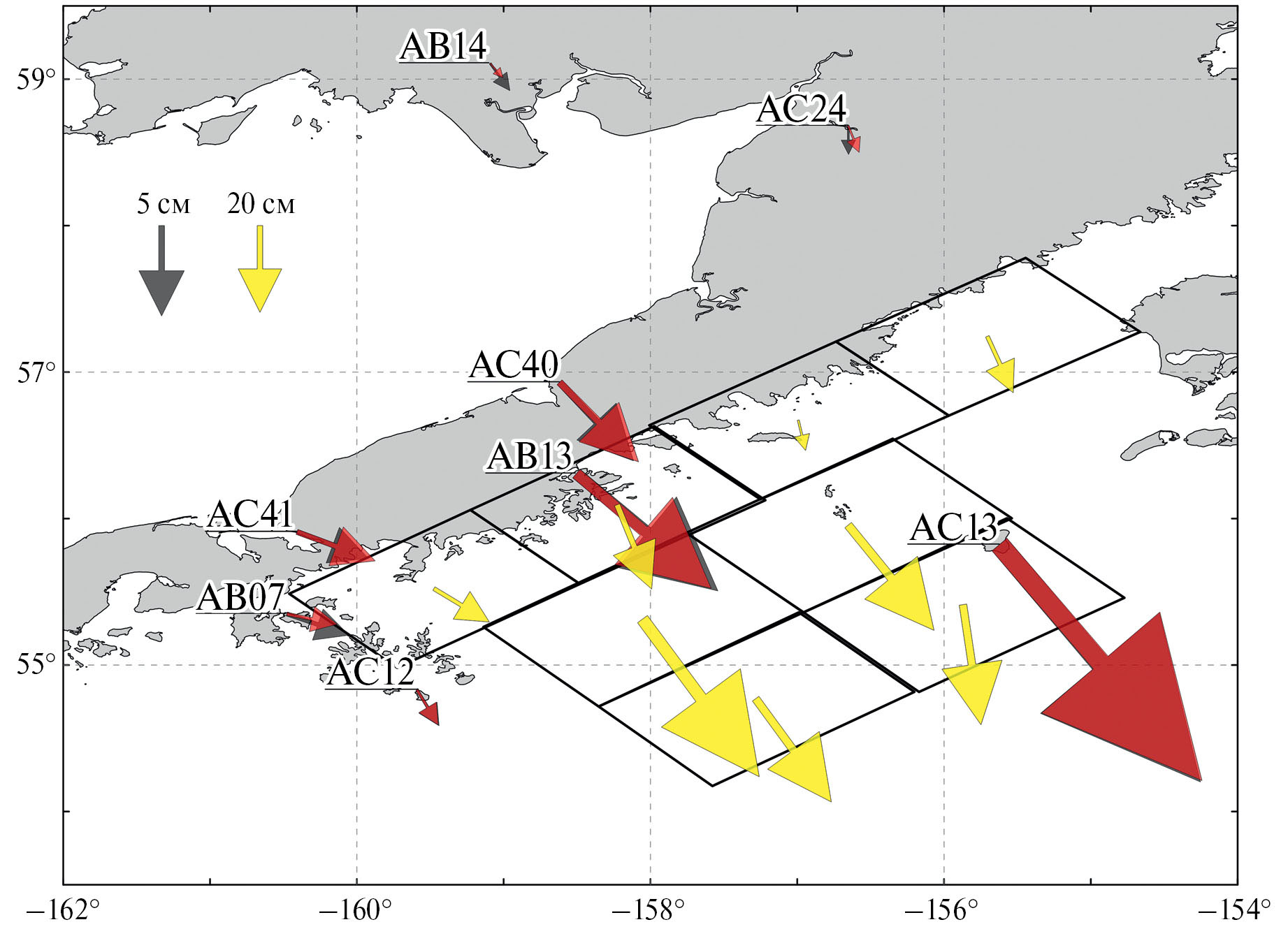 Ранее в районе землетрясения Чигник уже было зафиксировано несколько крупных событий (M = 8.2 в 1938 г., М = 7.8 в 2020 г.), а восточнее располагается очаговая зона гигантского Великого Аляскинского землетрясения 1964 г. с магнитудой M = 9.2 (рис. 1) [Suito, Freymueller, 2009; Ali, Freed, 2010]. Коэффициент сцепления плит, оцениваемый по данным GPS, существенно меняется вдоль восточной части Алеутской дуги [Li, Freymueller, 2018]. Он равен почти единице (полное сцепление) в области Великого Аляскинского землетрясения, западнее, в области землетрясения Чигник, он снижается до 0.5–0.6 и далее на запад становится менее 0.2. В работах [Cross, Freymueller, 2008; Drooff, Freymueller, 2021] на основе данных о средней скорости сближения плит и смещений на пунктах GPS сделан вывод о том, что со времени последнего сильного землетрясения 1938 г. M = 8.2 дефицит смещений в районе землетрясения Чигник мог достичь 5 м. Западнее очаговой области землетрясения Чигник, где расположена так называемая Шумагинская сейсмическая брешь, и где коэффициент сцепления невелик, с начала ХХ-го века и до 2020 г. не наблюдалось сильных землетрясений [Davies et al., 1981; Ye et al., 2021]. Вопрос о соотношении очаговой области и области постсейсмического крипа землетрясения Чигник с областью Шумагинской бреши и Великого Аляскинского землетрясения имеет важное значение для оценки сейсмического потенциала всего региона.