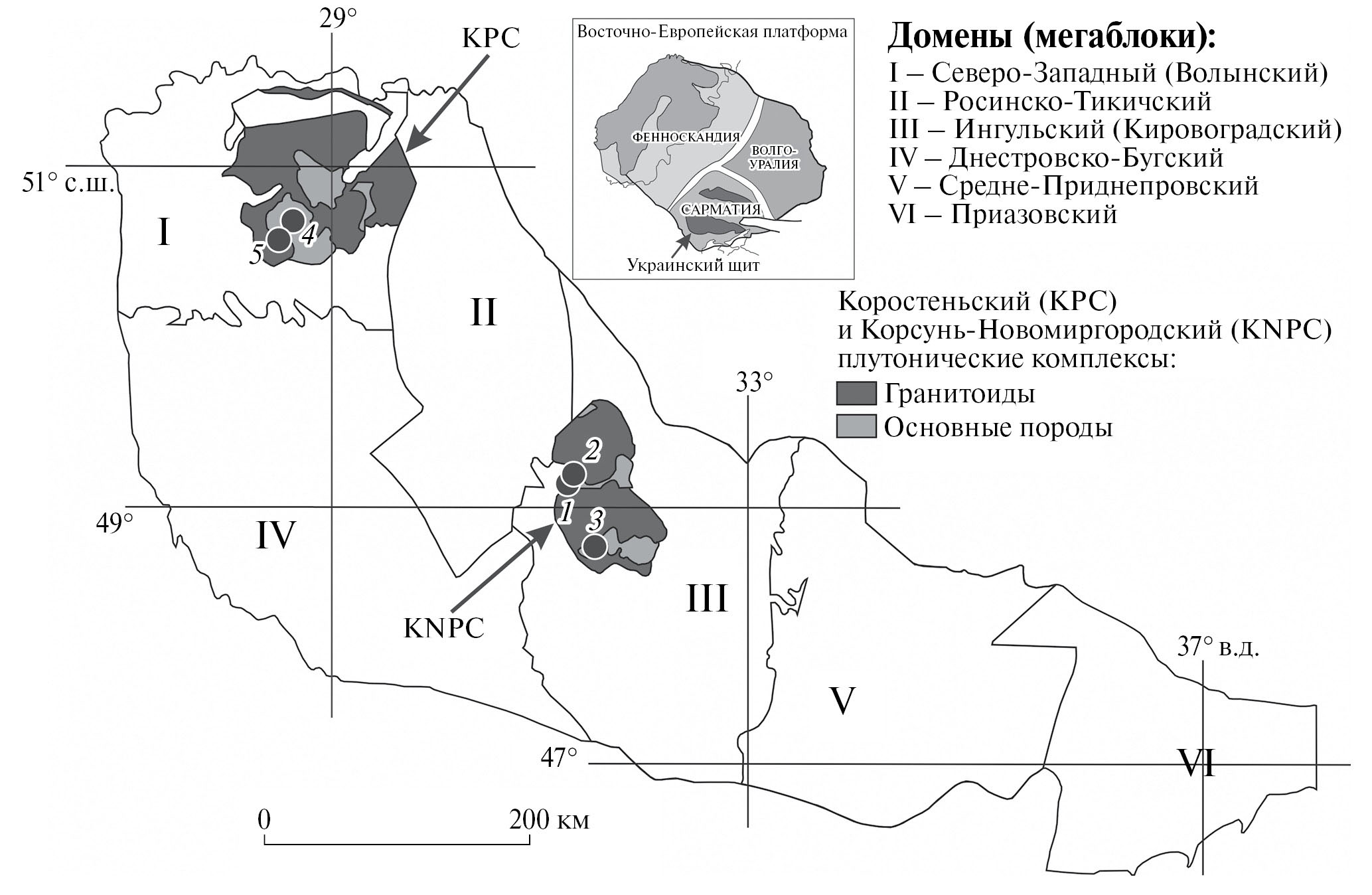 Украинский щит представляет собой выход кристаллического фундамента протократона Волго-Сарматия, который вместе с Фенноскандинавским сегментом коры образует Восточно-Европейский кратон (Балтика). В состав Восточно-Европейской платформы входят Фенноскандия, Волго-Уралия и Сарматия, при этом каждый фрагмент отличается своей эволюцией (рис. 1). Различные мегаблоки Украинского щита (УЩ) можно рассматривать как единое целое, начиная с 1.77 млрд лет назад.