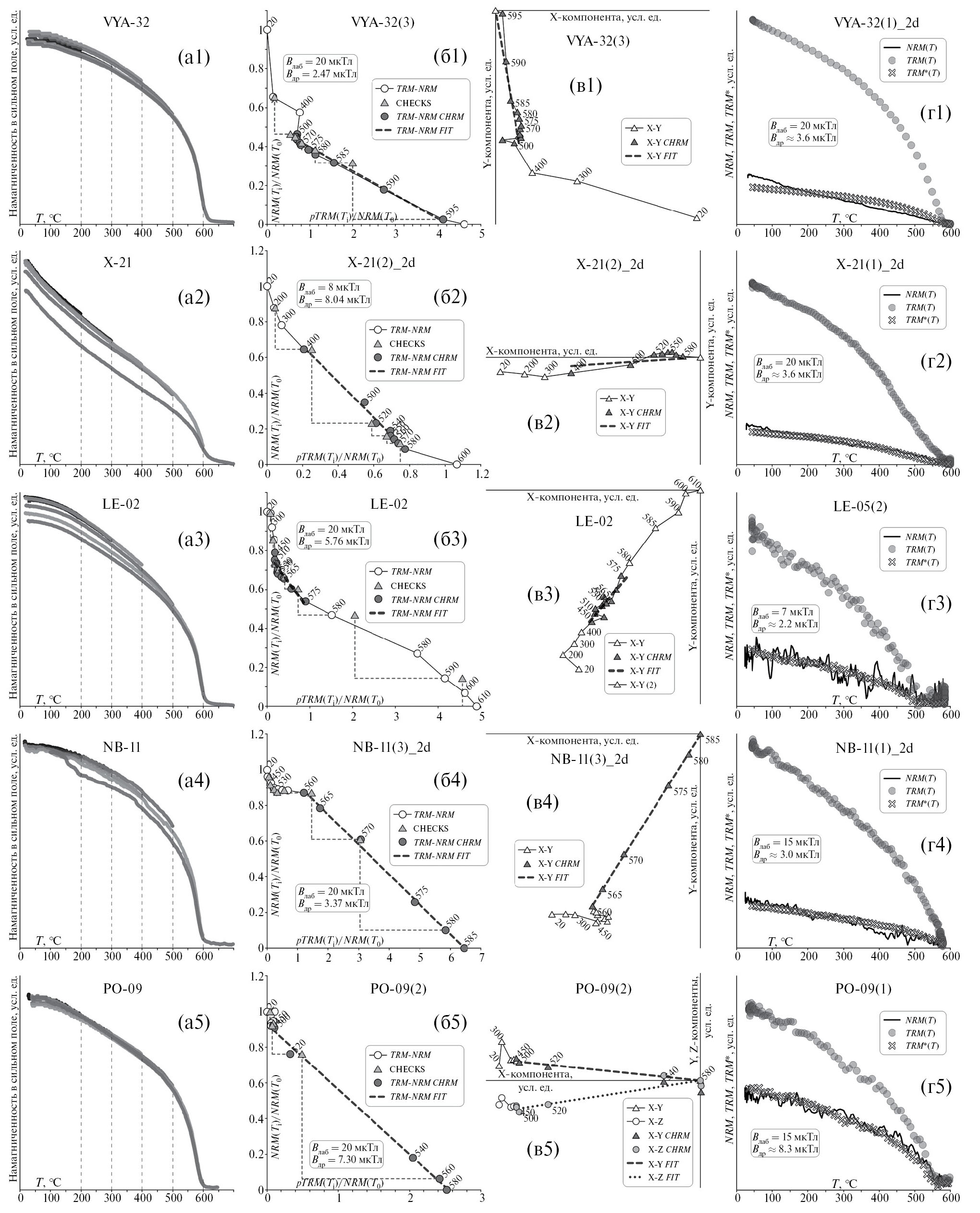 Рис. 2. Иллюстрации к термомагнитным свойствам пород, процедурам Телье–Коэ и Вилсона: образцы VYA, X, LE – Ингульский мегаблок, Корсунь-Новомиргородский комплекс; образцы PO, NB – Волынский домен, Коростенский Плутон. (а1–а5) – термомагнитные кривые Msi(T), нормированные на Msi(T0); (б1–б5) – диаграммы Араи–Нагаты, треугольники— чек-точки (check-points); пунктиром отмечен интервал (fit-интервал), по которому оценивается Bдр; (в1–в5) – диаграммы Зийдервельда (в координатах образца), построенные по данным процедуры Телье–Коэ; (г1–г5) – диаграммы Вилсона в представлении NRM–TRM.