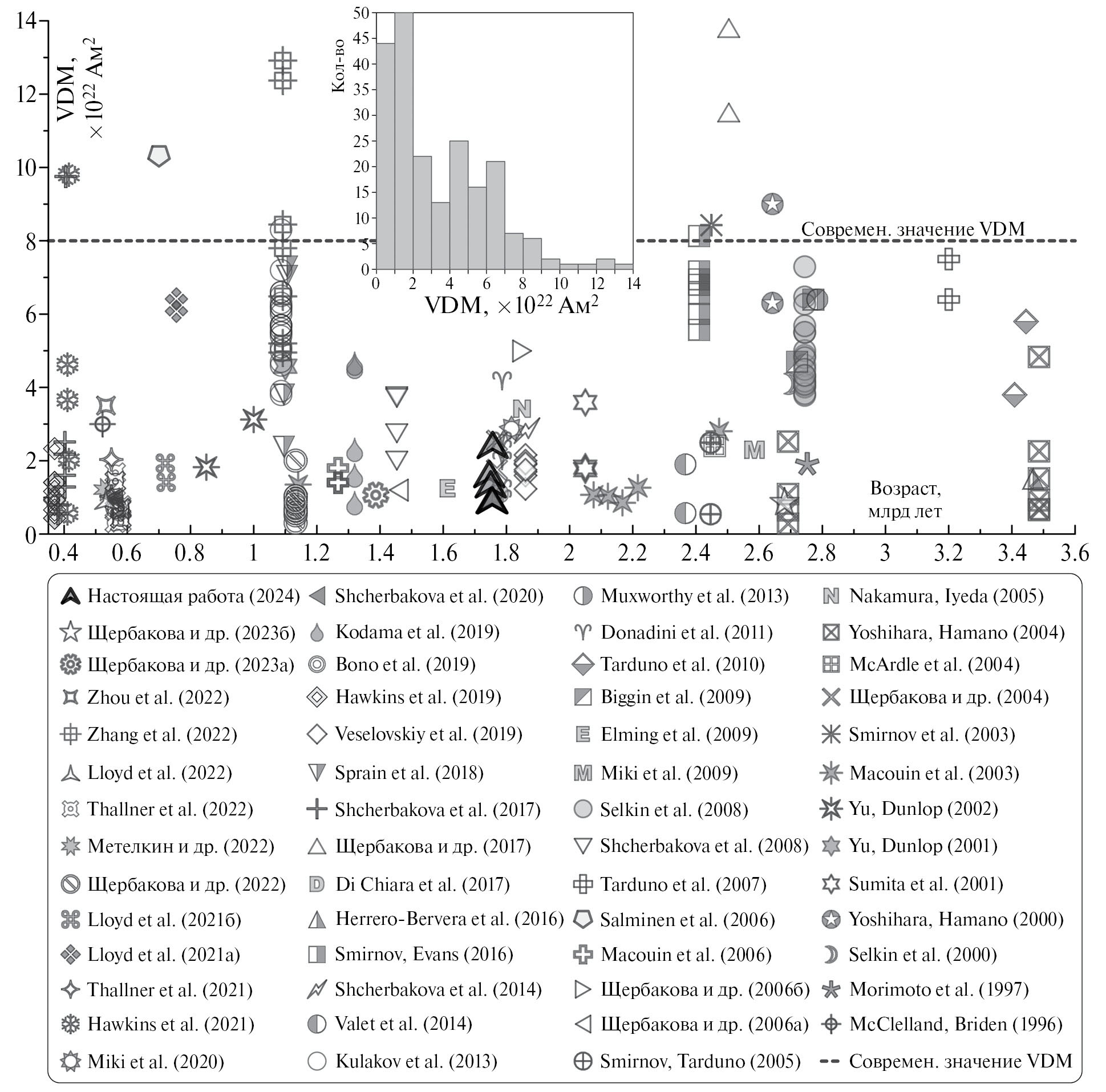 Другими словами, достоверная картина поведения палеонапряженности на протяженных временных интервалах может дать независимые свидетельства о фактическом времени возникновения внутреннего ядра. Но для этого необходимо иметь достаточно представительный ряд достоверных определений палеонапряженности, позволяющий проводить статистические оценки изменений в ее поведении. Однако определения палеонапряженности (Bдр) геомагнитного поля в докембрии крайне немногочисленны и имеют ограниченную надежность. Из всех представленных на сегодня в МБД [Мировая…, 2022] 5201 определений виртуального дипольного момента (VDM) подавляющее большинство сделано для кайнозоя: на протяженности в 66 млн лет имеется 3590 определений или 69%. Но если принять во внимание минимальные требования к надежности данных Bдр [Perrin, Shcherbakov, 1997], то в кайнозое (возраст до 66 млн лет) остается 1112 определений Bдр, а в протерозое, на интервале почти в 2 млрд лет (2500–538.8 млн лет) – всего 95. Становится очевидной необходимость получения новых надежных определений Bдр в докембрии.