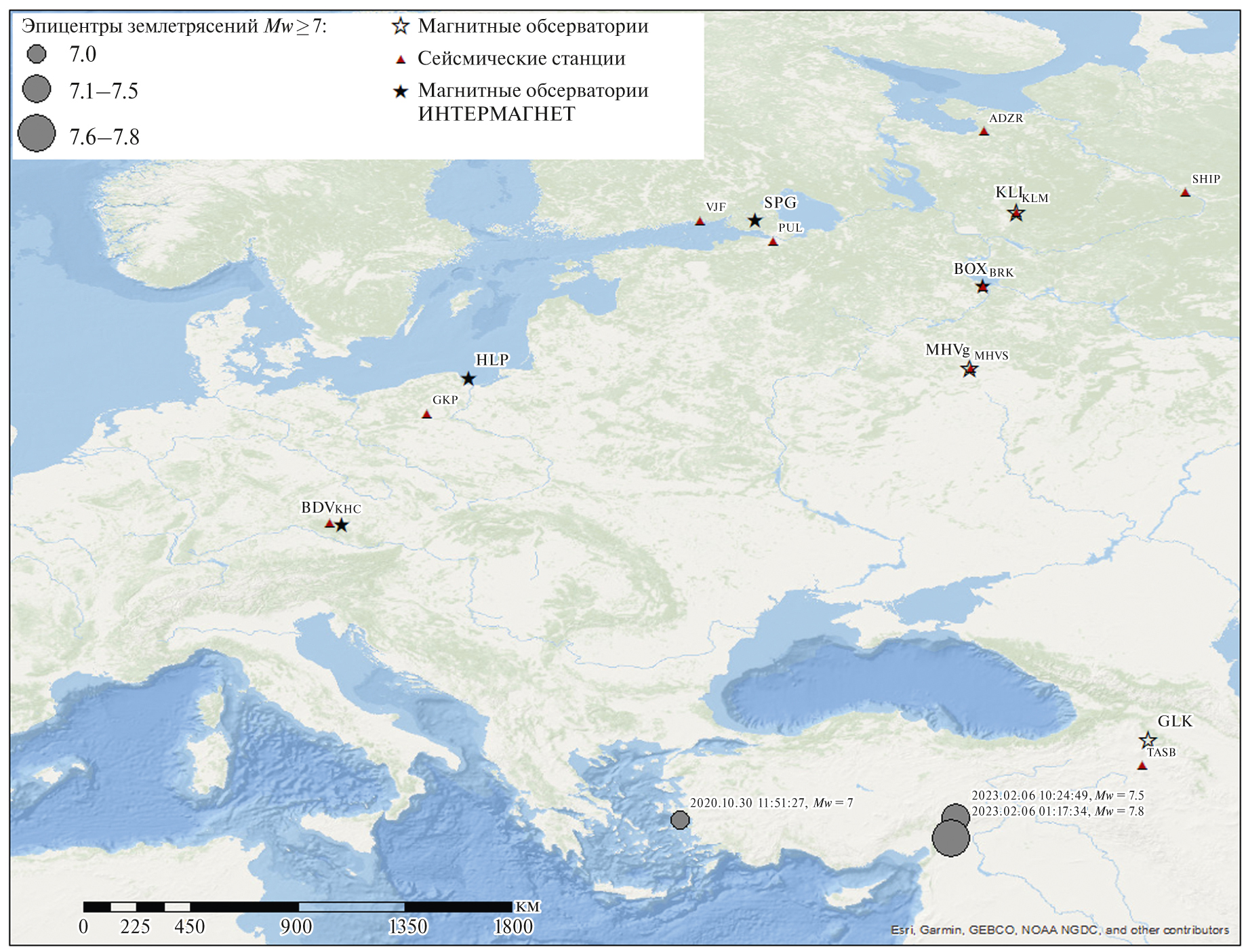 Основная проблема в изучении геомагнитного отклика от состоявшихся землетрясений связана со сложностью получения высококачественных данных из пунктов наблюдений, обеспечивающих мониторинг одновременно геомагнитной и сейсмической активностей в достаточной близи от очагов сильных землетрясений. Для возможности детального исследования такого отклика должны быть выполнены три условия: экстремально большая магнитуда землетрясения (Mw ≥ 7), наличие качественных 1-секундных наблюдений геомагнитного поля на относительно небольших (не более 25° или 3000 км) эпицентральных расстояниях, наличие сейсмической станции рядом с геомагнитной обсерваторией [Соловьев, 2023]. Регистрация секундных наблюдений геомагнитного поля приемлемого качества началась примерно с 2020 г. На сегодня ее обеспечивают несколько десятков обсерваторий, расположенных, в основном, в европейском секторе [Thomson, Flower, 2021]. В итоге лишь единичные сейсмические события удовлетворяют всем перечисленным условиям. К ним, в частности, относятся несколько землетрясений, произошедших в 2020–2023 гг.