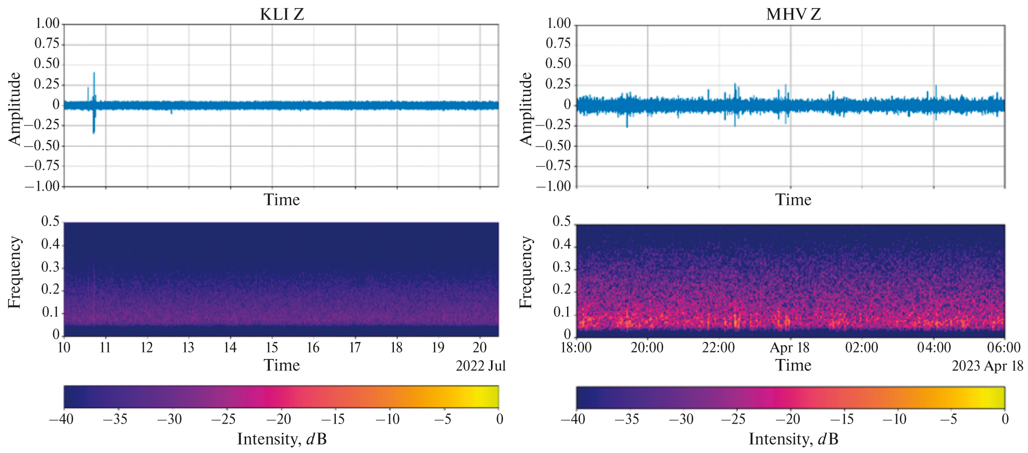 На рис. 4 приведены характерные шумовые характеристики 1-секундных векторных измерений магнитного поля, которые используются в настоящей работе. На рисунке приведены результаты, полученные по вертикальной Z-компоненте, наиболее чувствительной к внешним электромагнитным шумам. Из графиков видно, что характерный нижний порог амплитуды шумов составляет 0.1–0.2 нТл. К сожалению, далеко не все обсерватории, на которых осуществляется регистрация 1-секундных наблюдений, обеспечивают такое качество измерений, что не позволяет их использовать в изучении геомагнитного отклика от землетрясений. Например, если геомагнитная обсерватория находится в зоне относительно сильных электромагнитных шумов, то это вынуждает срезать частоты интересующего диапазона (>0.05 Гц) в 1-секундных геомагнитных измерениях на уровне АЦП.