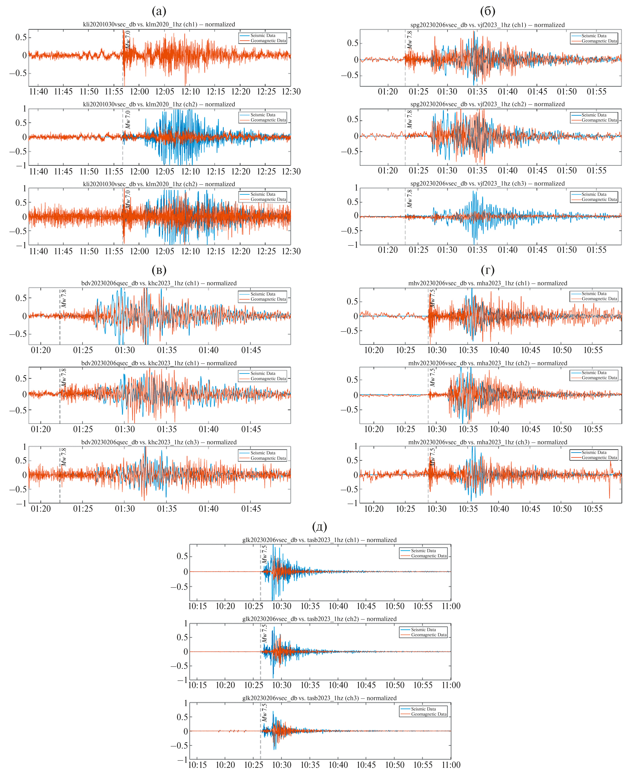 Рис. 5. Примеры совмещенных графиков северной (верхний), восточной (средний) и вертикальной (нижний) компонент смещений (синий) и dB/dt (оранжевый) в нормированном виде за вычетом среднего по данным пары наблюдений KLM-KLI для ЗТ-1 (а); VJF-SPG для ЗТ-2 (б); KHC-BDV для ЗТ-2 (в); MHVs-MHVg для ЗТ-3 (г); TASB-GLK для ЗТ-3 (д). Вертикальной пунктирной линией обозначен момент прихода P-волны на соответствующую сейсмическую станцию.