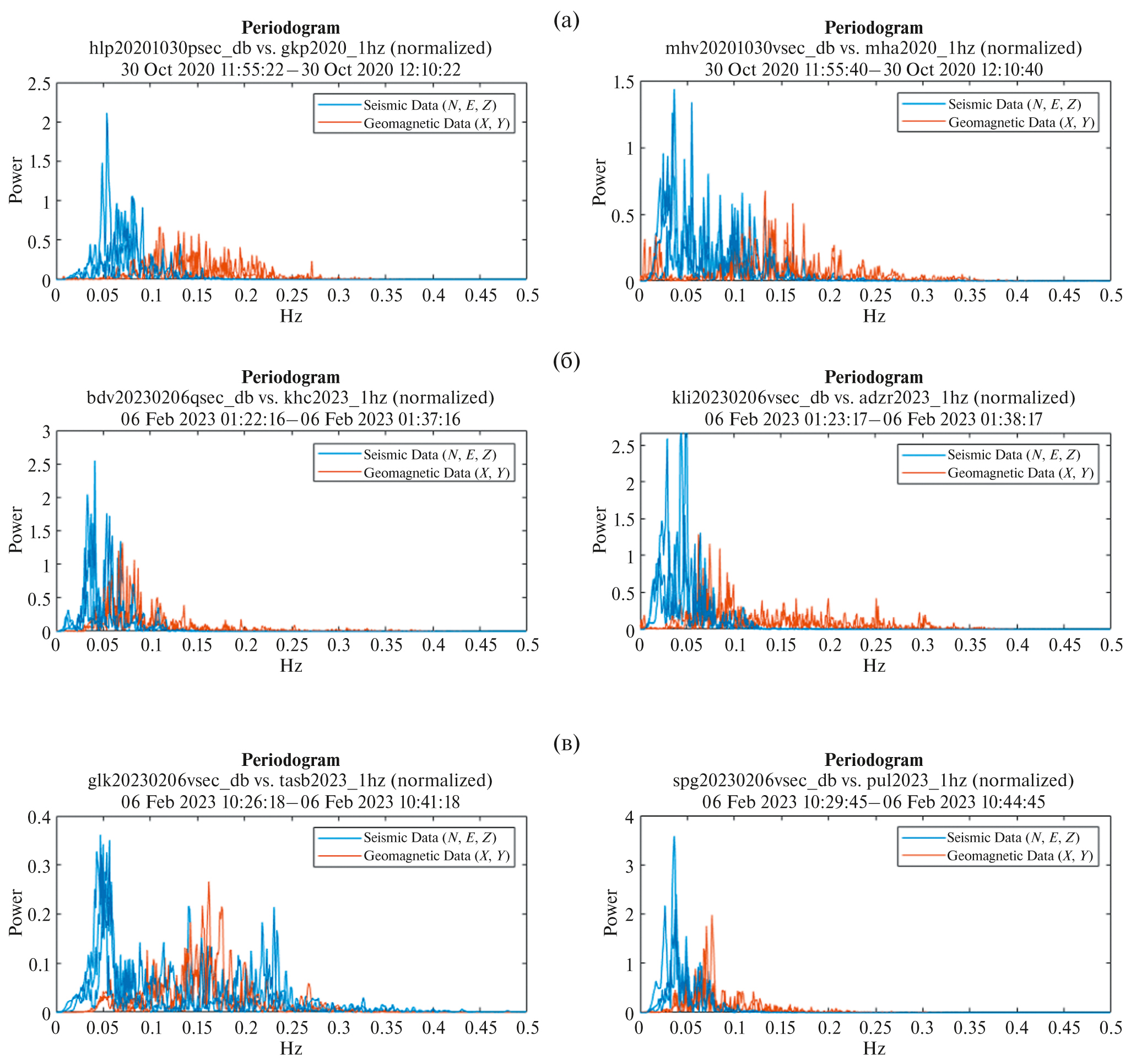Рис. 6. Примеры периодограмм по нормированным данным для трех компонент смещений (синий) и двух горизонтальных компонент скорости изменения магнитного поля (оранжевый), зарегистрированных за 15-минутный интервал с момента первого вступления: пары пунктов наблюдений GKP-HLP и MHVs-MHVg для события ЗТ-1 (а); KHC-BDV и ADZR-KLI для события ЗТ-2 (б); TASB-GLK и PUL-SPG для события ЗТ-3 (в).