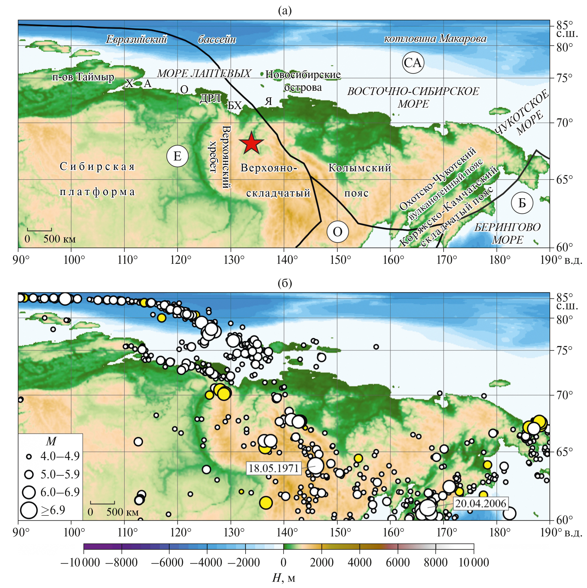 Континентальная часть исследуемой области представлена c запада на восток Таймырским складчатым поясом, занимающим полуостров Таймыр, докембрийской Сибирской платформой, мезозойским Верхояно-Колымским складчатым поясом, Охотско-Чукотским вулканогенным поясом и кайнозойским Корякско-Камчатским складчатым поясом (рис. 1а) [Зоненшайн и др., 1990a; 1990б]. На Таймырском полуострове эпицентры редких слабых землетрясений приурочены к его восточному побережью (рис. 1б) [Середкина, Козьмин, 2017; Morozov et al., 2021b]. Относительно высокий уровень сейсмической активности наблюдается на побережье Анабарского и Оленекского заливов моря Лаптевых, а также в дельте реки Лены. Здесь эпицентры большинства землетрясений тяготеют к крупным разрывным нарушениям субширотной ориентации, обрамляющим практически асейсмичную Сибирскую платформу [Имаева и др., 2017]. Наиболее сильные сейсмические события Верхоянского хребта сосредоточены в его северной части и представлены Булунскими землетрясениями 1927–1928 гг. (5 событий с M = 5.8–6.8), связанными с Хараулахтской системой разломов [Имаев и др., 1998; 2000; Fujita et al., 2009]. Согласно работе [Steblov et al., 2003] полюс вращения Евразийской и Северо-Американской литосферных плит расположен в непосредственной близости от эпицентров Булунских землетрясений (рис. 1). При этом в позднеинструментальный период наблюдений (с 1960 г.) во всем Верхоянском хребте регистрировались лишь относительно немногочисленные события с M < 5.0.
