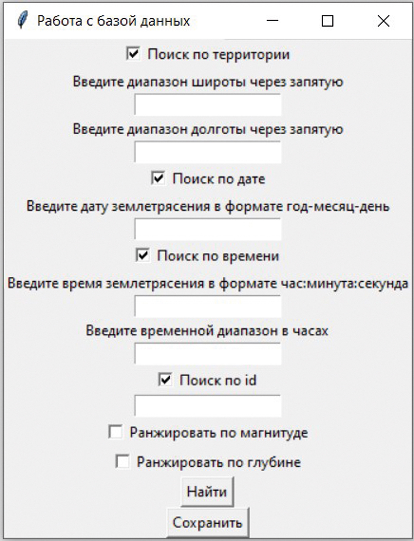 Технически база данных создавалась с помощью PgAdmin – программы кроссплатформенного типа для работы с PostgreSQL-серверами. Графический интерфейс, позволяющий пользователям осуществлять поиск в базе данных по различным атрибутам (координатам, дате, времени, идентификатору), а также ранжировать результаты поиска по магнитуде и глубине очага, был разработан на языке Python (рис. 2). Результаты запроса могут быть сохранены в отдельный файл с названием и расширением, указанными пользователем. Виджеты GUI были созданы на основе модуля Tkinter. Подключение к базе данных и выполнение запросов реализовано с помощью модуля Psycopg2.
