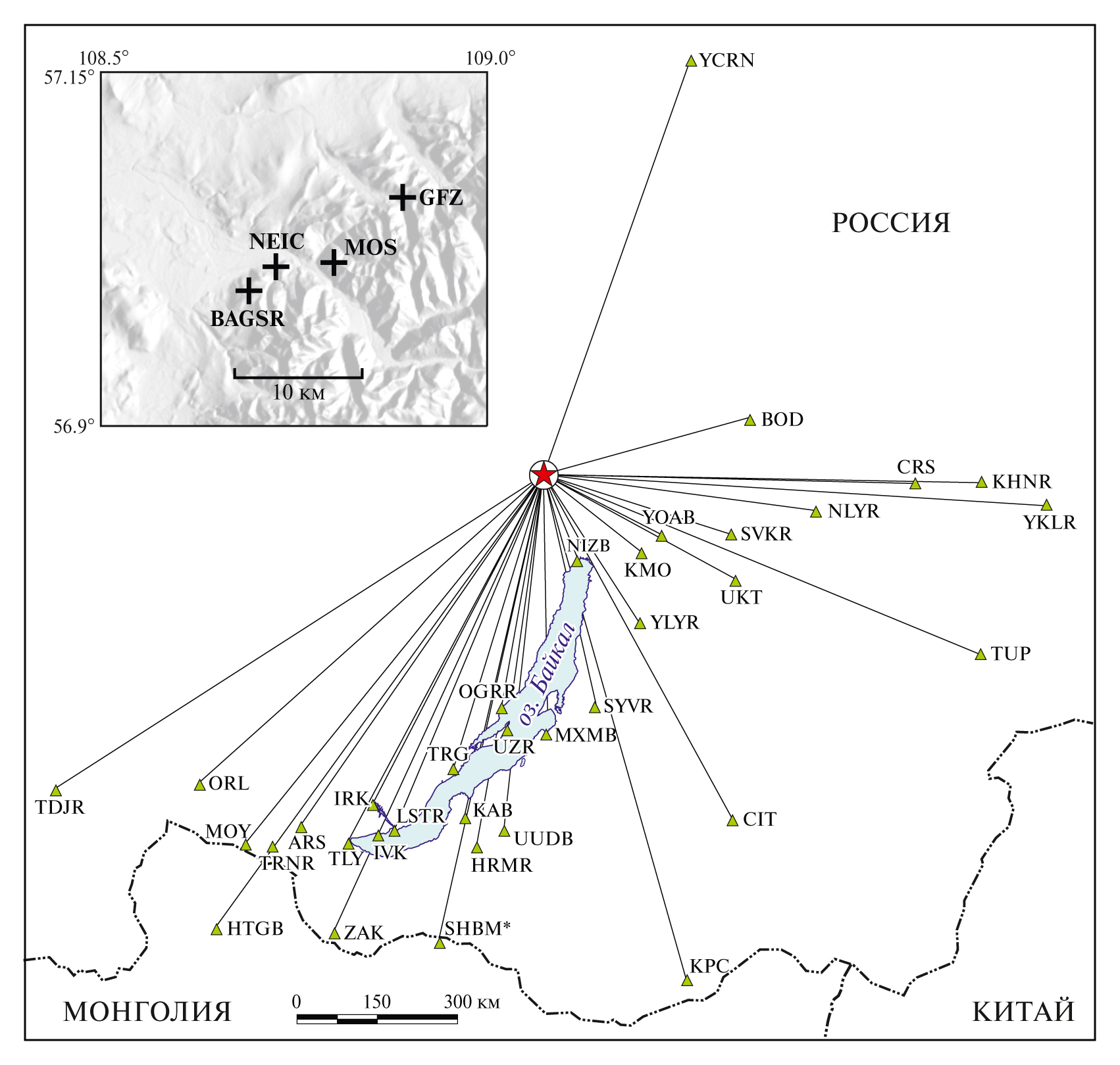 Рис. 2. Положение эпицентра Акитканского землетрясения 27.12.2023 г. (кружок со звездочкой) относительно региональных сейсмических станций, данные которых использовались при обработке материалов наблюдений; * – код не является международным (станция SHBM). На врезке показано положение эпицентра согласно определениям различных агентств (табл. 1).