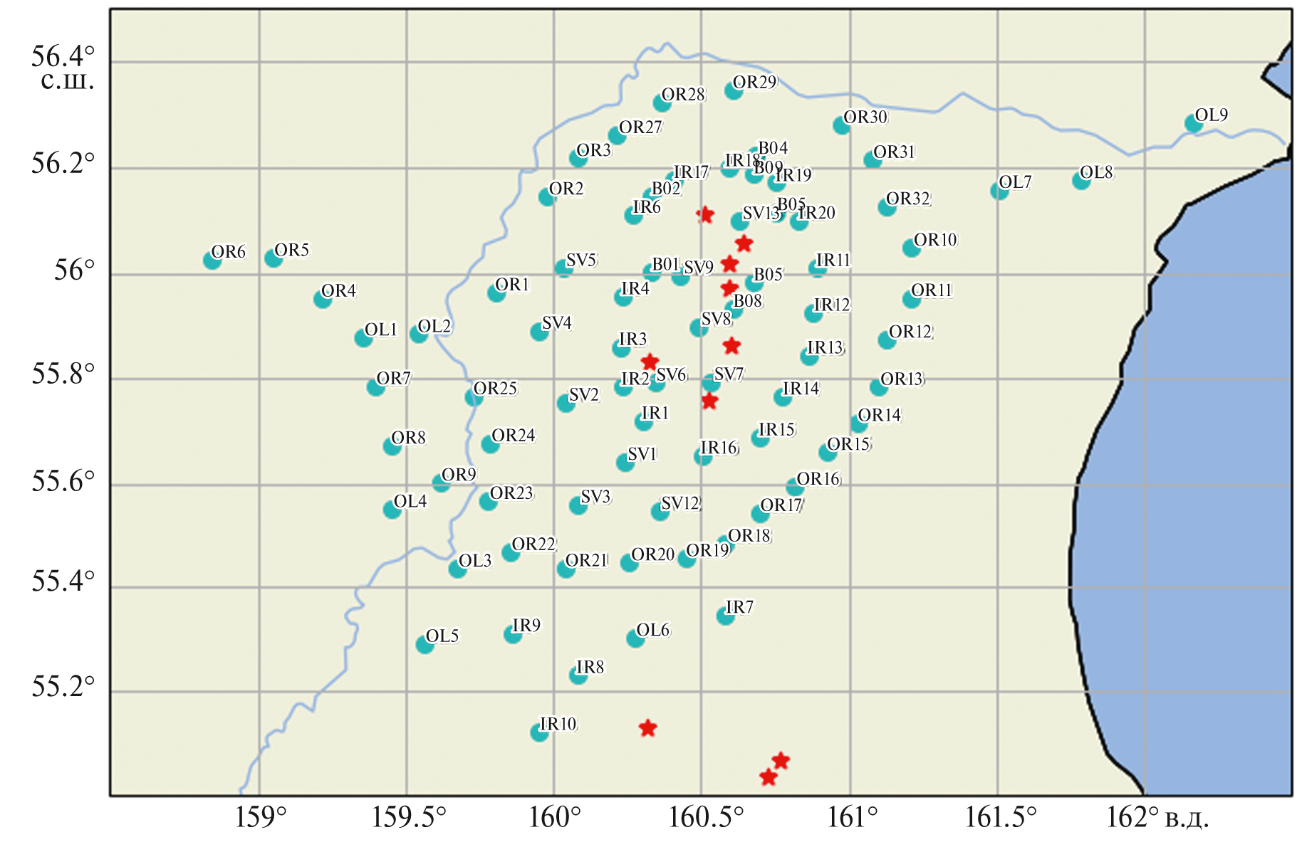Рис. 1. Карта расположения временных станций эксперимента KISS. Голубые круги – временные станции; красные звезды – вершины вулканов.