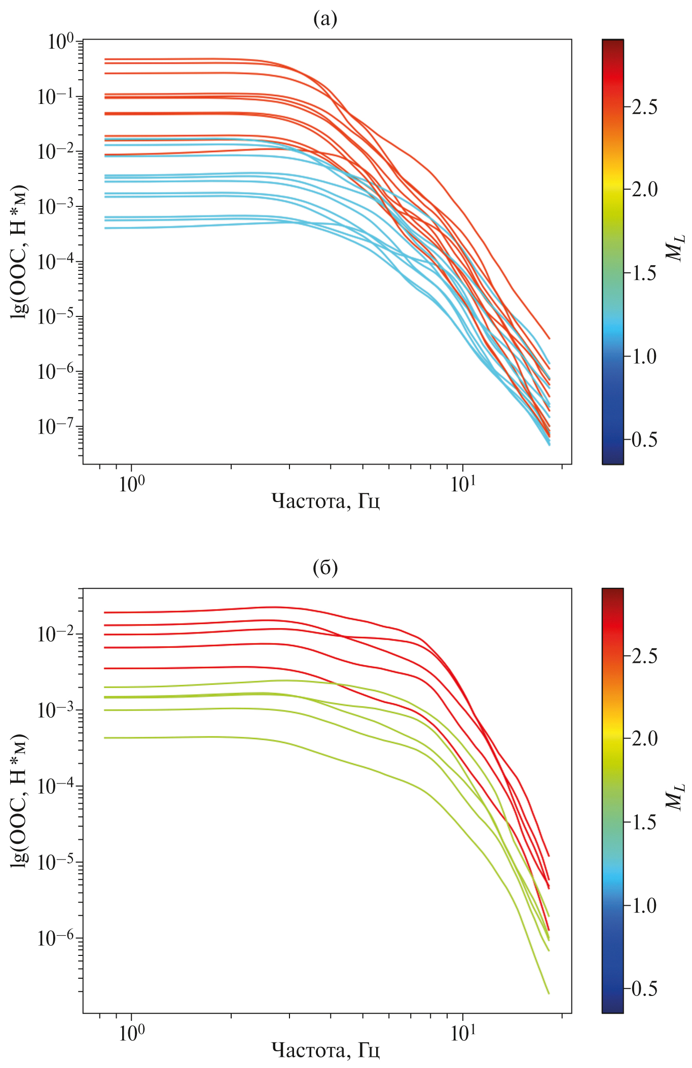 Рис. 6. Очаговые спектры смещений (ОСС) сильного и слабого ДП (а) и ВЧ (б) землетрясений, цвет присваивается автоматически в соответствии со значением магнитуды ML, которая извлекается из каталога КФ. Параметры ДП землетрясений – 2015.11.28 15:54:05 с ML = 2.45 и 2015.11.28 14:37:21 с ML = 1.0; ВЧ землетрясений – 2015.10.20 17:06:30 с ML = 2.65 и 2015.11.20 12:28:19 с ML = 1.6.