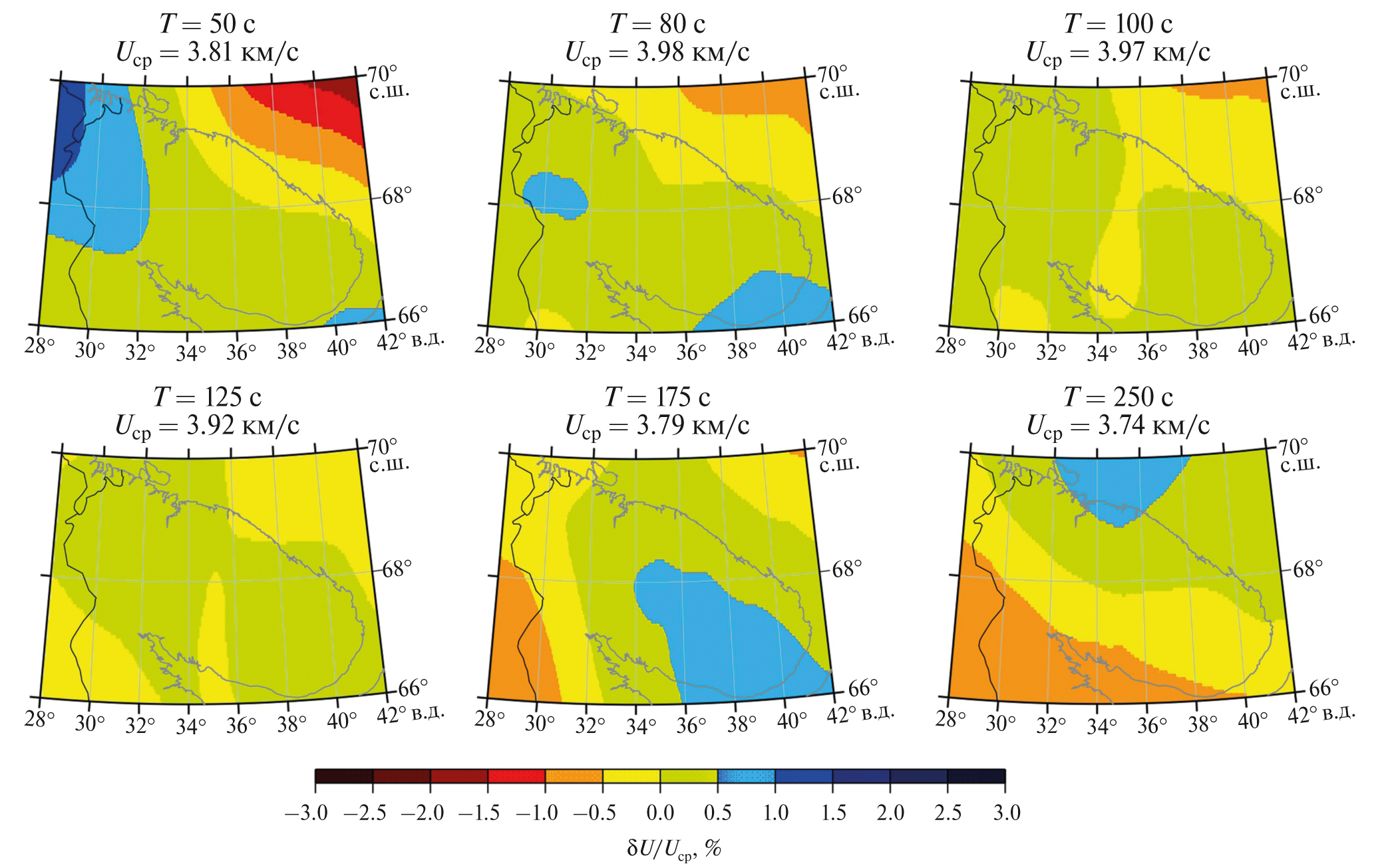 Рис. 2. Вариации групповых скоростей волн Рэлея относительно средних значений (ΔU / Uср, %) согласно [Филиппова, Соловей, 2022]. Над каждой картой указаны соответствующие значения периодов (T, с) и средних скоростей (Uср, км/c).