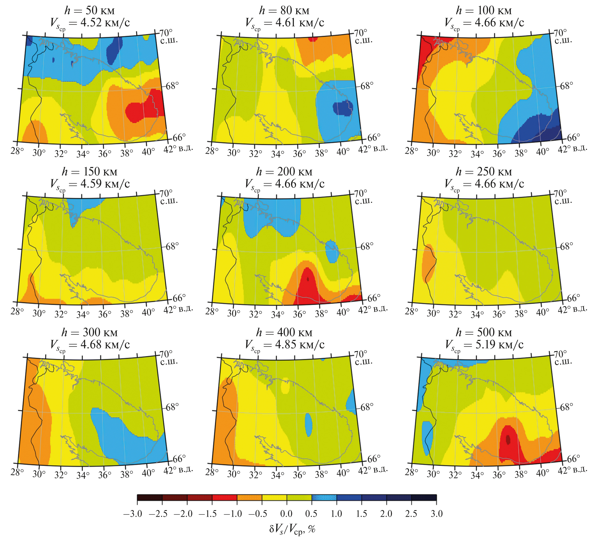 Рис. 4. Вариации скоростей S-волн относительно средних значений на отдельных глубинах (ΔVS / VSср, %). Над каждой картой указаны соответствующие значения глубин (h, км) и средних скоростей (VSср, км/с).