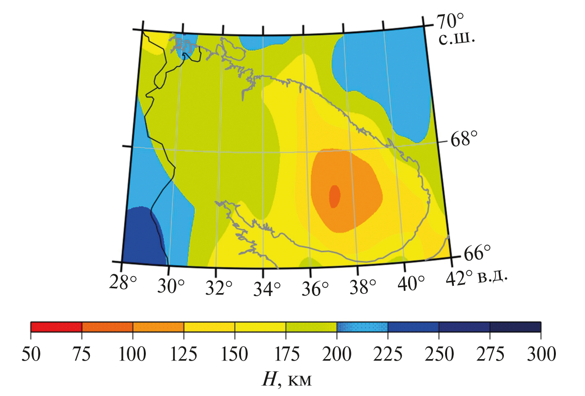 Полученные карты распределения скоростей на всех представленных глубинах (рис. 4) не выявляют субширотной зональности, прослеживаемой в тектоническом строении Кольского региона [Мудрук и др., 2013]. Напротив, из них следует, что скорости в верхней мантии под рассматриваемым регионом по горизонтали наиболее сильно изменяются в направлении восток–запад. В пользу того, что такая особенность изменения скоростей не является артефактом, связанным с недостаточным горизонтальным разрешением результатов поверхностно-волновой томографии, свидетельствует схожий характер вариаций термической мощности литосферы под Кольским регионом, полученный на основе гравиметрических данных в работе [Artemieva, 2019]. Так, мощность термической литосферы, согласно этой модели, уменьшается в восточном направлении и не имеет субширотной зональности (рис. 6). Отсутствие субширотной зональности также проявляется в распределениях поверхностного теплового потока [Глазнев, 2003] и глубины залегания нижней границы магнитоактивного слоя литосферы [Филиппова, Филиппов, 2023; Lu et al., 2022] с учетом погрешностей ее определения.
