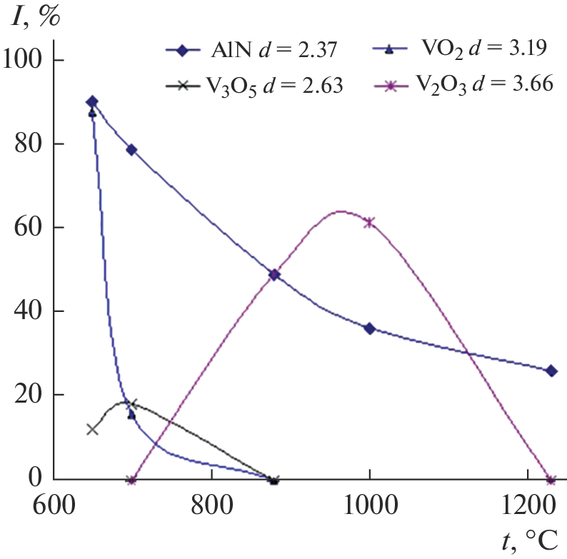 Interactions in the V2O5–AlN system have been studied using chemical analysis, X-ray diffraction, and thermal analysis in combination with mass spectrometry. The results demonstrate that heating mixtures with AlN/V2O5 molar ratios ≥2.33 to above 1100°C leads to the formation of the vanadium nitrides V2N, VN0.81, and VN among condensed reaction products. No formation of solid solutions of aluminum in vanadium or vanadium aluminides during heating has been detected in the temperature range studied. Chemical interaction of V2O5 with AlN meets Baikov’s transformation sequence principle: V2O5 → VO2 → V4O7 → V3O5 → V2O3 → VO → V.