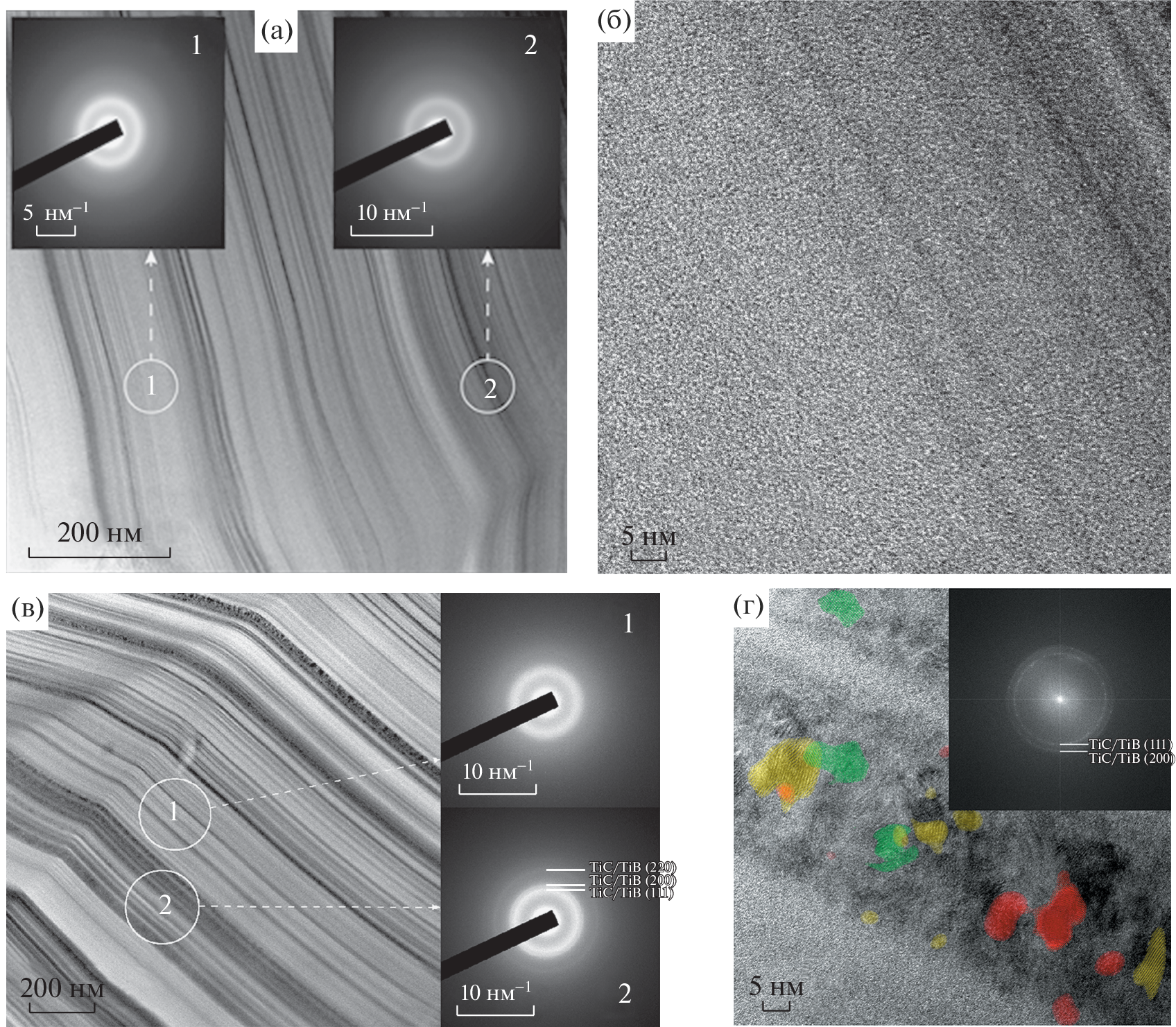 Покрытия систем Zr–B–Si–C–Ti и Zr–B–Si–C–Ti–N впервые были получены методом ионно-плазменного вакуумно-дугового осаждения в остаточной атмосфере аргона и азота. Покрытие Zr–B–Si–C–Ti характеризуется аморфно-нанокристаллической структурой. Нанокристаллиты формировались в системе Ti–B–C, а аморфная составляющая структуры образована фазами Zr–B–C и Si–C. Покрытие второй системы имеет преимущественно аморфную структуру (степень аморфизации ~85–93%), которая формируется на основе нитрида титана с наличием связей Ti–B и Ti–C, карбоборнитрида (Zrx(C,N,B)y), борида циркония и карбонитрида кремния.