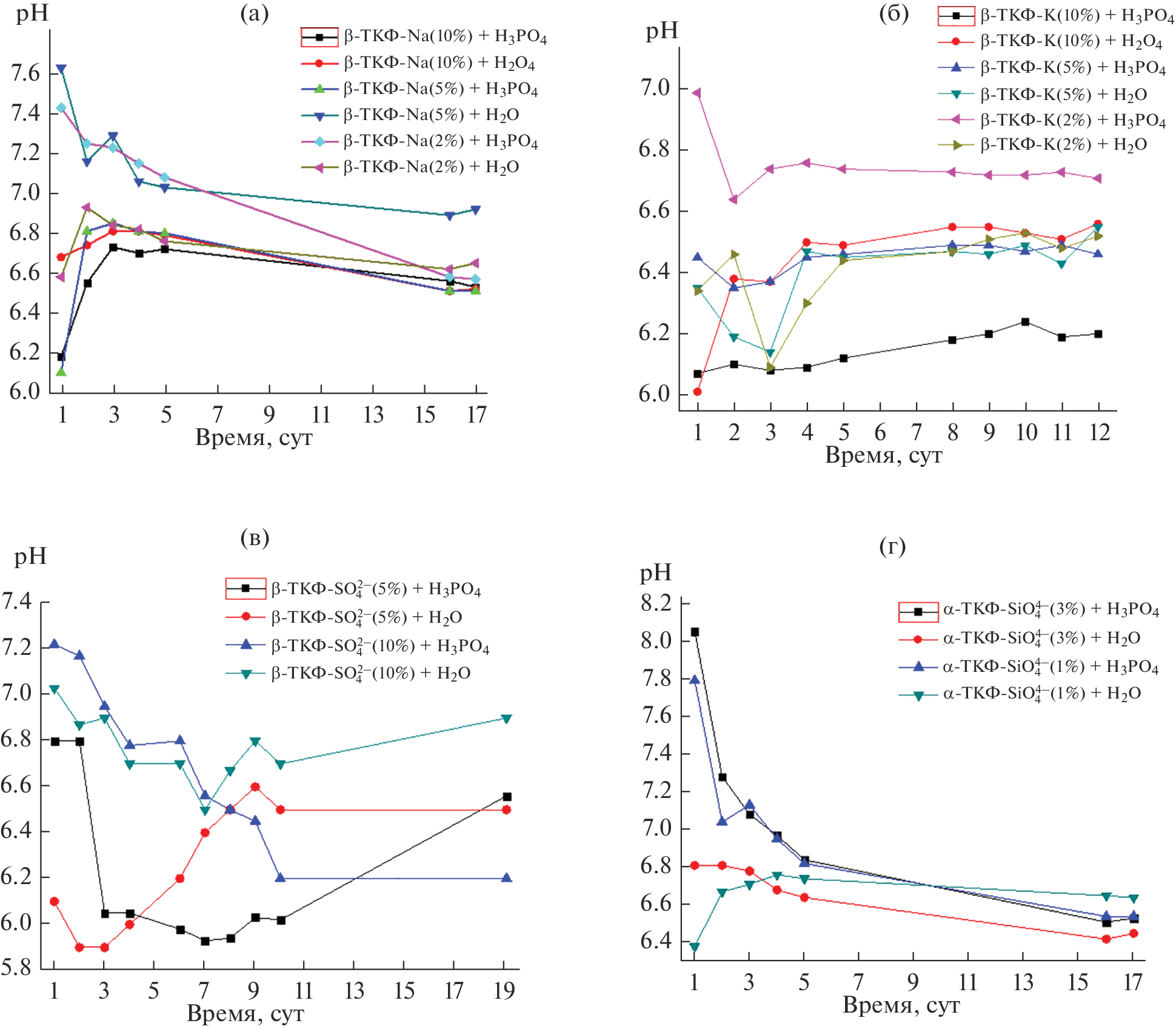 . The mixing liquid used to prepare phosphate cements from substituted TCP was orthophosphoric acid or H2O, and TCP was mixed with dry Ca(H2PO4)2·H2O. Isomorphous substitutions of Na+ and K+ for Ca2+ ions and PO43- and PO42- for SiO44-, SO42 were confirmed by scanning electron microscopy, X-ray microanalysis, and X-ray diffraction. It has been shown that, as a result of hardening of cement pastes with the use of different mixing liquids, one can obtain materials differing in microstructure, in which brushite or monetite prevails, depending on the TCP phase used in the preparation of the cement. In addition, we have studied interaction of the cements with water for a long time (16 days). The pH of the aqueous medium has been shown to vary from 5 to 7.5. This pH range is favorable for medical applications of the phosphate materials studied.