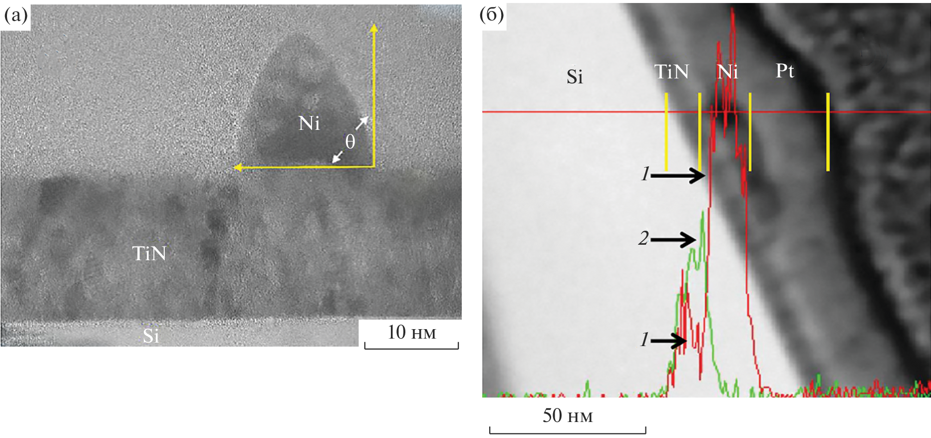 We have studied the effect of annealing conditions on the formation of nickel particles on a titanium nitride barrier layer produced by atomic layer deposition. The results demonstrate that the nanoparticle size depends on annealing temperature and time. At temperatures above 700°C, annealing for more than 5 min results in coalescence, which leads to particle growth and a decrease in the surface density of the particles. During annealing, nickel diffuses into the titanium nitride and the amount of nickel on the surface decreases. The experimental data agree with results of nanoparticle formation modeling in the hydrodynamic model. We have determined the catalyst–buffer interaction potential and melt viscosity, which demonstrate that, in the case of melting of a thin nickel layer, on the order of a few nanometers in thickness, the metal is similar to a supercooled liquid. Modeling results suggest that, during annealing of a thin metal film/barrier layer couple, the average nanoparticle size is smaller at lower potentials of interaction between the constituent materials of the couple.