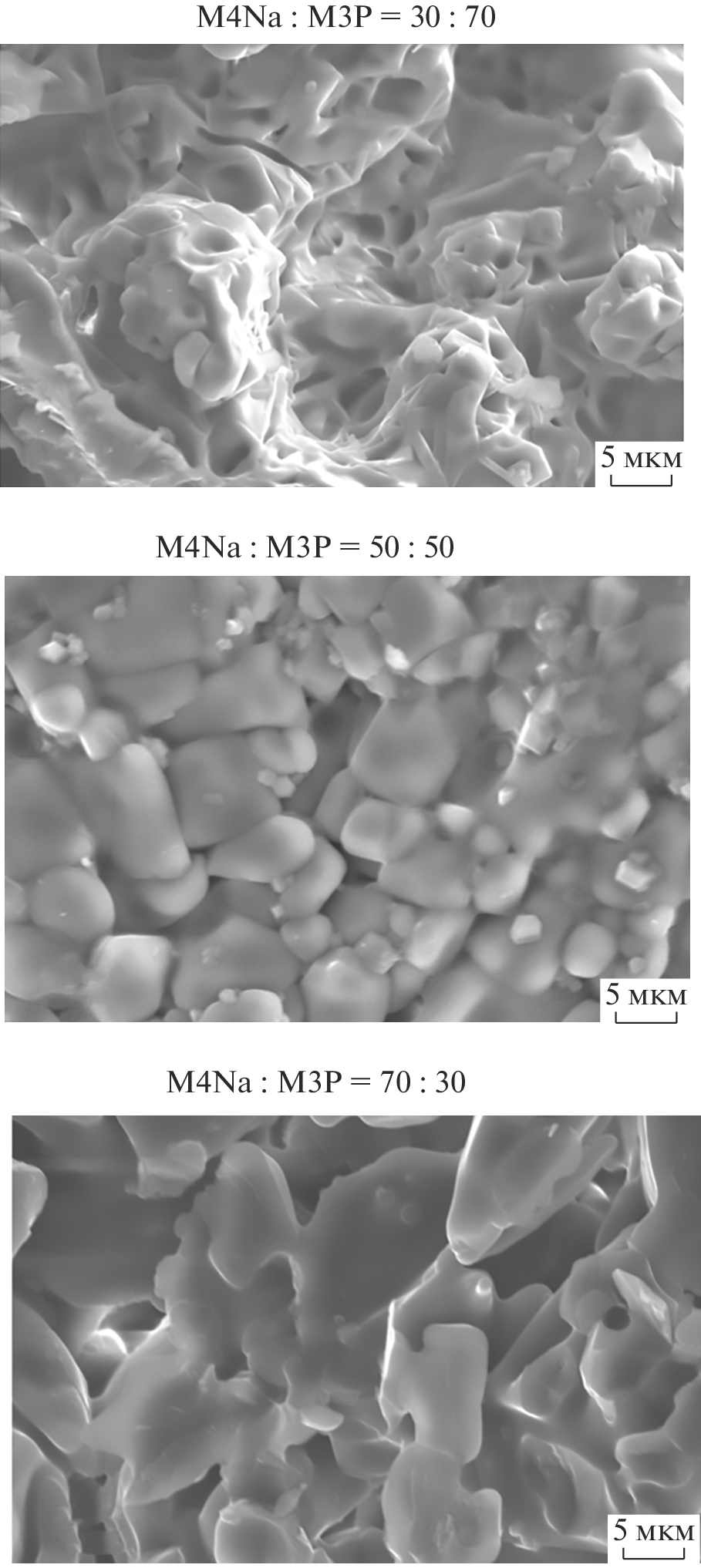 The Mg3(PO4)2–Mg4Na(PO4)3 system has been studied using thermal analysis, X-ray diffraction, and X-ray microanalysis. Firing the constituent phosphates at 800°C has been shown to cause no phase changes, whereas firing above 1000°C leads to the formation of a single-phase material, which is due to the incongruent melting of the magnesium sodium double orthophosphate Mg4Na(PO4)3. The homogeneity range of the compounds in the Mg3(PO4)2–Mg4Na(PO4)3 system differing in composition has been determined by X-ray microanalysis. The microstructure of Mg3–xNa2x(PO4)2-based ceramic materials prepared by sintering at a temperature of 1000°C has an average grain size under 10 μm. The synthesized bioceramic materials are potentially attractive for use as implants for bone tissue regeneration.