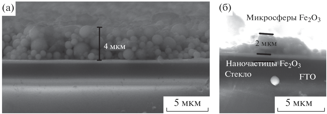We have studied photoelectrochemical and photocatalytic properties of porous materials based on hollow α-Fe2O3 microspheres, characterized by the presence of dangling magnetic Fe–O–Fe bonds due to an increased oxygen vacancy concentration on the wall/closed pore interface. Using such powder and firing slips at an isothermal holding temperature of 400°C, we obtained two series of thin-film samples on glass with a conductive layer from suspensions of two compositions: aqueous Fe(NO3)3 solution + hollow α-Fe2O3 microspheres (series 1) and aqueous Fe(NO3)3 solution + polyethylene glycol + hollow α-Fe2O3 microspheres (series 2). The films of series 2 were shown to have a structure with spatially separated particles differing in size: α-Fe2O3 nanoparticles and hollow α-Fe2O3 microspheres. The films of series 1 consisted predominantly of hollow microspheres connected by “necks” formed during heat treatment. The thickness of the films of series 2 was of order 2 μm and that of the films of series 1 was of order 4 μm. The structural distinctions between the films of the two series had a significant effect on the optical properties of the material. In the wavelength range 350–1500 nm, the absorption coefficient of the films of series 2 (3.50 × 105 m–1) was about twice that of the films of series 1 (1.75 × 105 m–1). Photoelectrochemical characterization in an aqueous 0.1 M KOH solution showed that the onset potential for the anodic reaction was 0.87 V vs. Ag/AgCl in the case of the films of series 2 and 0.97 V vs. Ag/AgCl in the case of series 1. The films of both series showed an unusual increase in current density during prolonged illumination at a potential of 1 V vs. Ag/AgCl, due to Fe(IV) formation on the photoanode surface. Photocatalytic properties of the materials were assessed from the rate of methylene blue degradation. The reaction rate constant (k) was determined to be 0.015 and 0.018 min–1 for the films of series 1 and 2, respectively, whereas the k of the photocatalyst-free reaction was 2.8 × 10–4 min–1.
