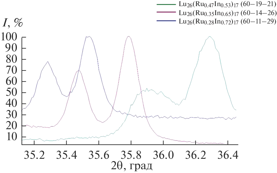 In the R–Ru–In (R—rare earth element) systems in the area with a high content of rare-earth elements (>60 at %), a number of isostructural compounds R26(RuxIn1 – x)17 (R = Pr, Nd, Sm, Gd, Tb, Dy, Ho, Er, Tm, Lu) were found, which crystallize in a tetragonal cell (P4/mbm) with the Sm26(Co0.65Ga0.35)17 structure type, as well as Pr21Ru8.2In5 compounds in a tetragonal cell (I4/mcm) with the Y3Rh2 structure type and Gd6Ru2In in a rhombic cell (Immm) with the Ho6Co2Ga structure type. The samples were prepared by arc-melting the stoichiometric quantities of elementary components. The structures were determined by single-crystal X-ray diffraction and refined by the Rietveld method using powder patterns. Compounds R26(RuxIn1–x)17 (R = Dy, Ho, Er, Tm, Lu) exist in the homogeneity range 0.28 < x < 0.47. All crystal structures of the obtaining compounds are based on a frame from atoms of rare earth elements, inside which are smaller in size atoms of ruthenium and indium. A general fragment of all the considered structures are columns of various lengths from InR8 tetragonal prisms and RuR8 tetragonal antiprisms conjugated by mutual bases. The new compounds have a congruent melting pattern.
