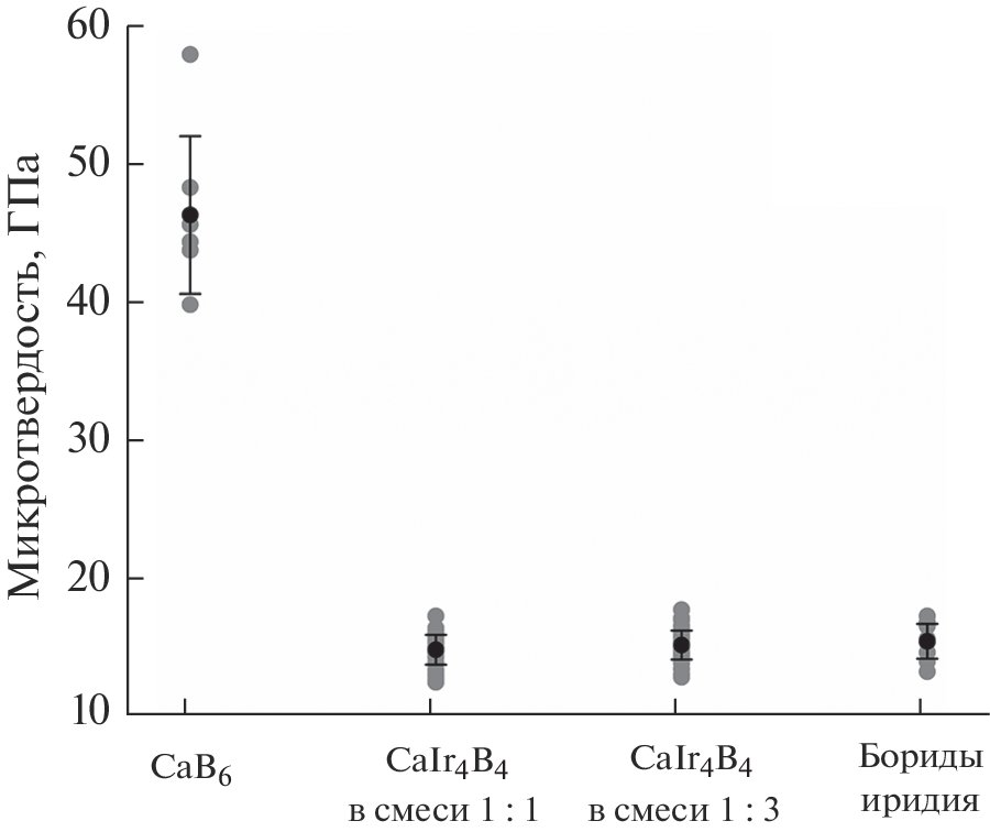 We have studied the thermal expansion of CaIr4B4, IrB1.1, and CaB6. The results demonstrate that the crystal lattices of these phases expand linearly with temperature and that their thermal expansion coefficients lie in the range (5–10) × 10–6 K–1. We have determined the average microhardness of the CaIr4B4, IrB1.1, and CaB6 phases. The average microhardness of the CaIr4B4 phase is ~15 GPa, which is a factor of 3 lower than that of the CaB6 phase