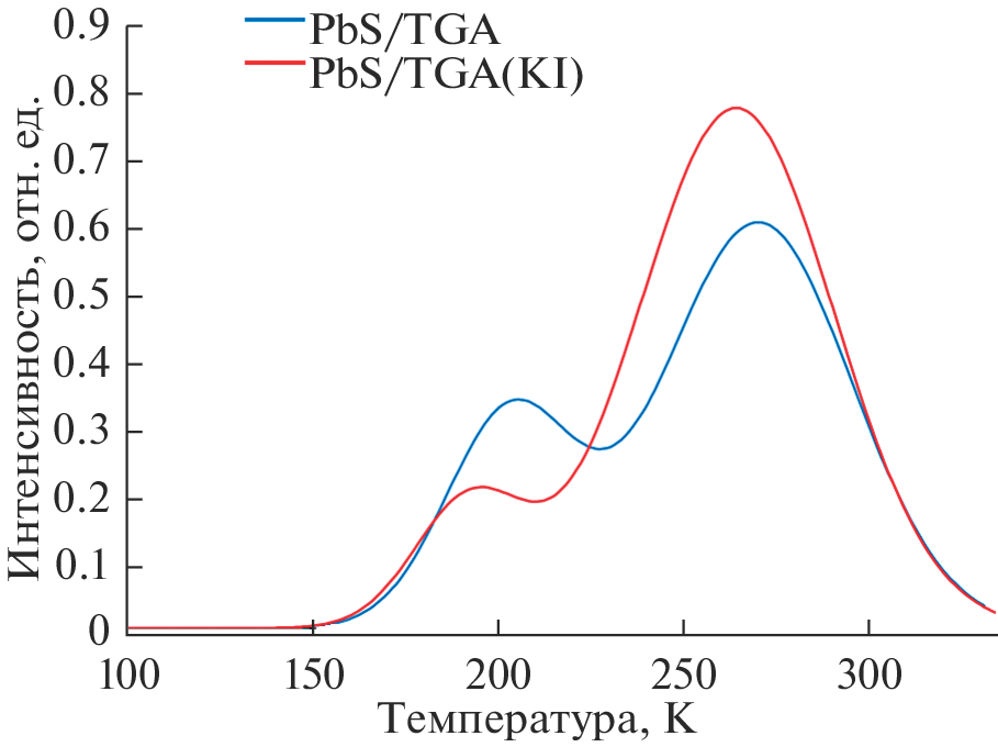 In this paper, we discuss general trends in the IR luminescence of colloidal PbS quantum dots 3 nm in average size, capped with thioglycolic acid molecules (PbS/TGA QDs). Treatment of the PbS/TGA QDs with a KI solution has been shown to cause a shift of a composite luminescence band peaking at 1120 nm to shorter wavelengths, to 1060 nm; an increase in the quantum yield of its shorter wavelength component, related to excitonic emission, from 1 to 10%; and quenching of its longer wavelength component, due to radiative recombination at defect levels. In this process, the cubic structure of PbS undergoes no changes. The average size of the PbS/TGA QDs has been shown to decrease slightly, by 0.2–0.3 nm. The conclusion has been drawn that the increase in the quantum yield of excitonic emission from the PbS/TGA QDs as a result of KI treatment is due to the more efficient passivation of interfacial defects, which act as both recombination luminescence and nonradiative carrier recombination channels. Using thermoluminescence in the temperature range from 80 to 350 K, we have demonstrated the presence of two types of shallow localized states, at 0.17- and 0.25-eV depths, whose density is only slightly sensitive to treatment of the PbS/TGA QDs with a KI solution. We assume that some of the traps identified are due to native defects in the nanocrystals—interstitial lead and sulfur ions—rather than to dangling bonds of surface lead and sulfur atoms.