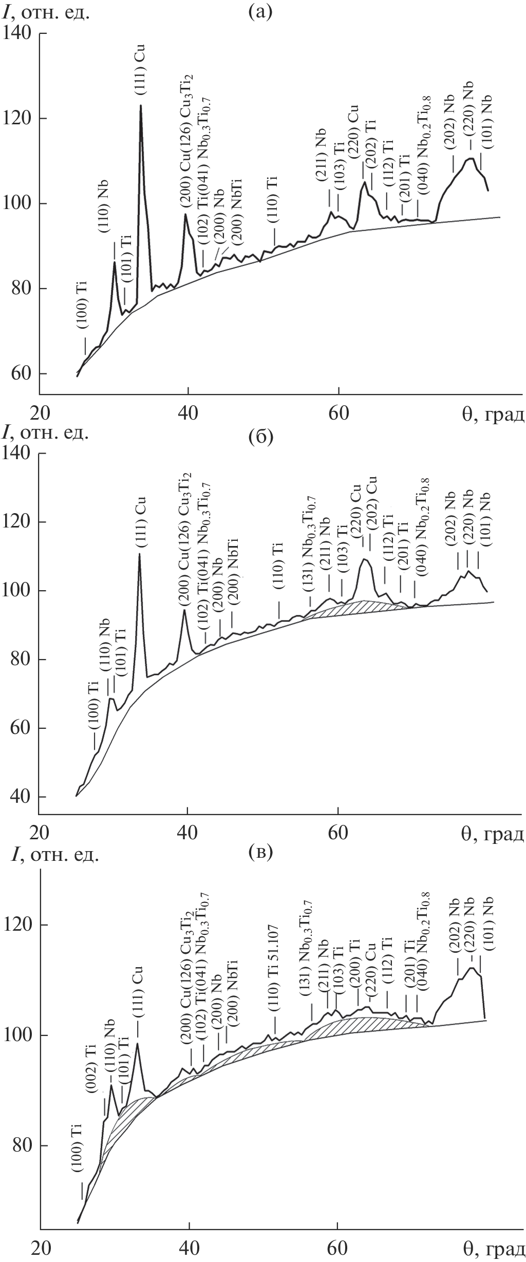Using repeated bundle extrusion of a Cu/NbTi composite, we have obtained a high-strength heterophase alloy having superconducting properties. X-ray diffraction characterization has shown that the material we obtained has an unstressed, relaxed structure in the form of self-consistent, locally diffusion-alloyed atomic groups ranging widely in size, which can be divided into three groups: (1) microcrystalline long-range-ordered particles about 450 Å in size, showing up as Debye peaks with sharp tops; (2) mesoscopic clusters with a nanoscale atomic order, responsible for broad diffuse lines; and (3) small low-dimensional atomic groups with short-range order (10–50 Å), responsible for incoherent diffuse X-ray scattering (very broad diffuse halos).