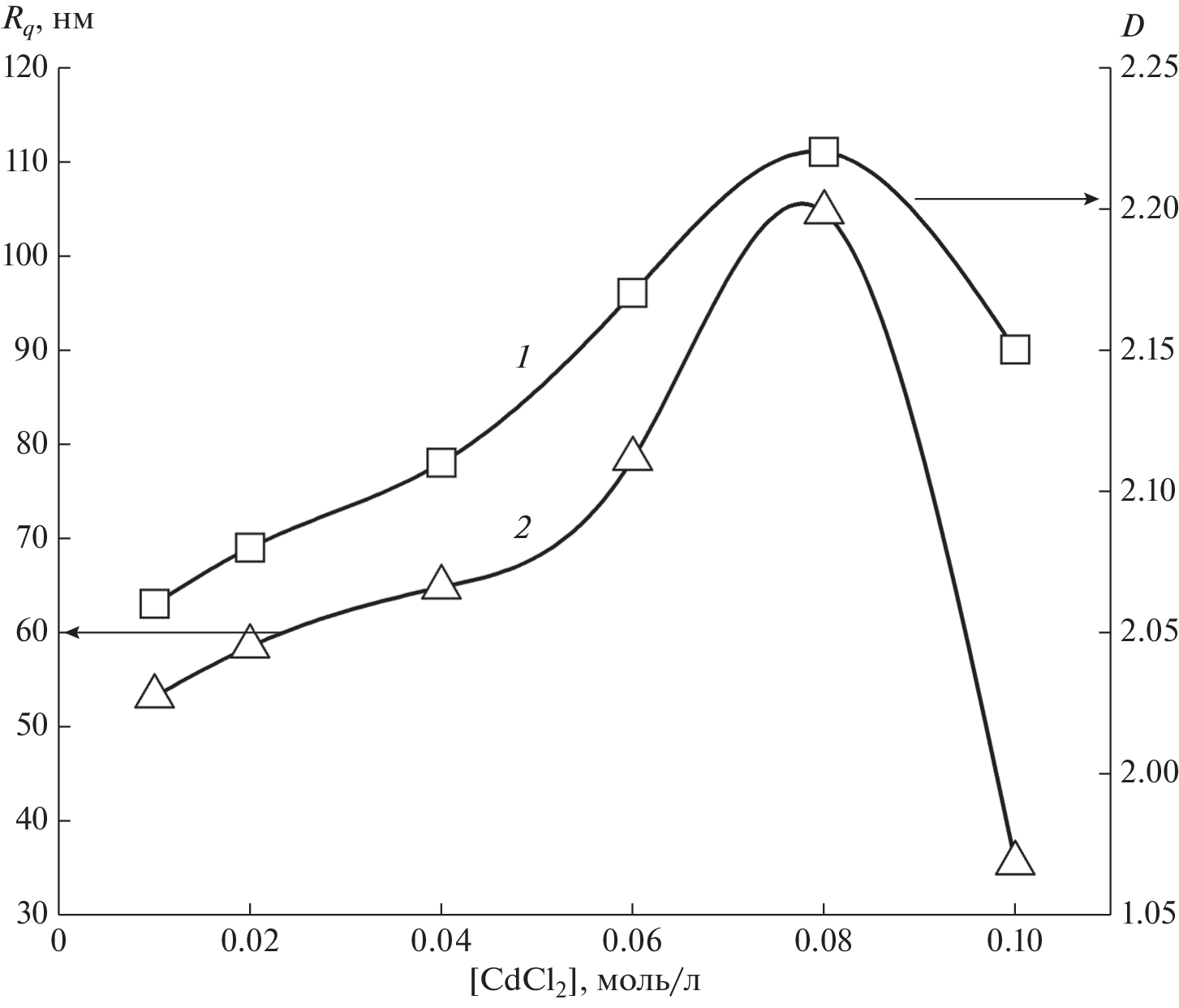 Методом химического осаждения получены двухфазные тонкопленочные композиты, состоящие из твердых растворов замещения CdxPb1 − xS (0.007 ≤ x ≤ 0.068) кубической структуры B1 (пр. гр. \(Fm\bar {3}m\)) и аморфного сульфида кадмия CdS. Методом атомно-силовой микроскопии исследована топология поверхности синтезированных пленок, рассчитаны параметры микрорельефа поверхности. Установлена корреляция между составом и функциональными свойствами тонкопленочных слоев CdS–PbS. Впервые исследована чувствительность двухфазных пленок CdxPb1 – xS/CdS к аммиаку NH3 в воздушной среде. Предел обнаружения составил 10 ppm (6.22 мг/м3) при комнатной температуре.