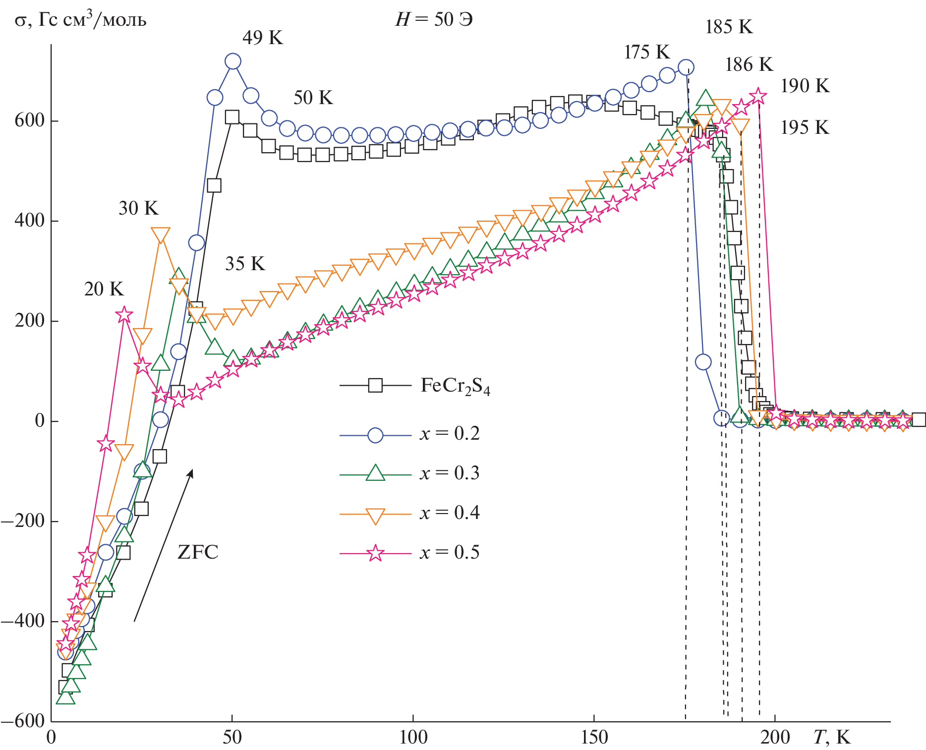 - Yang Z.R., Tan S., Zhang Y.H. Abnormal Temperature Dependence of Low-Field Magnetization of FeCr2–xAlxS4 // Appl. Phys. Lett. 2001. V. 79. № 22. P. 3645–3647. https://doi.org/10.1063/1.1419031